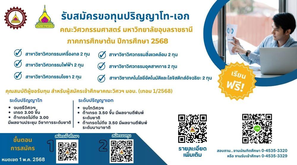 มหาวิทยาลัยอุบลราชธานี ประกาศรับสมัครบุคคลที่สมัครเข้าศึกษาระดับบัณฑิตศึกษา คณะวิศวกรรมศาสตร์ ภาคการศึกษาต้น ปีการศึกษา 2568 และสนใจสมัครขอรับทุนการศึกษาประเภทยกเว้นค่าธรรมเนียมการศึกษา ตั้งแต่บัดนี้ - 1 พฤษภาคม 2568 หากสนใจดูข้อมูลเพิ่มเติมได้ตามลิงก์ที่แนบ หรือมีข้อสงสัยติดต่อ งานบัณฑิตศึกษา โทร.0-4535-3320