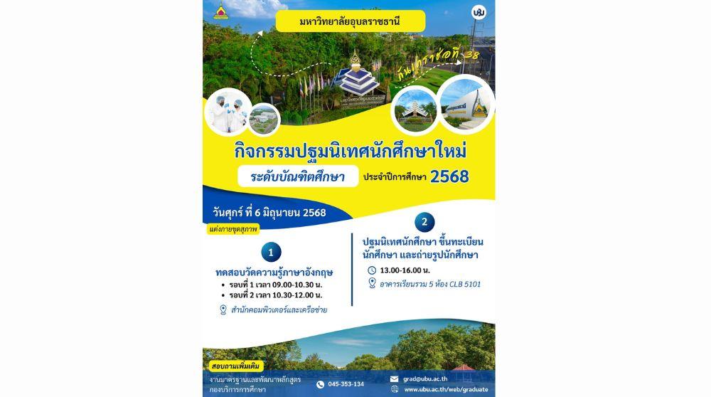 กองบริการการศึกษา ขอแจ้งกิจกรรมปฐมนิเทศนักศึกษาใหม่ ระดับบัณฑิตศึกษา ประจำปีการศึกษา 2568 ในวันศุกร์ที่ 6 มิถุนายน 2568 ดังนี้