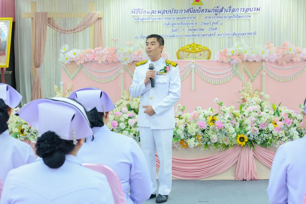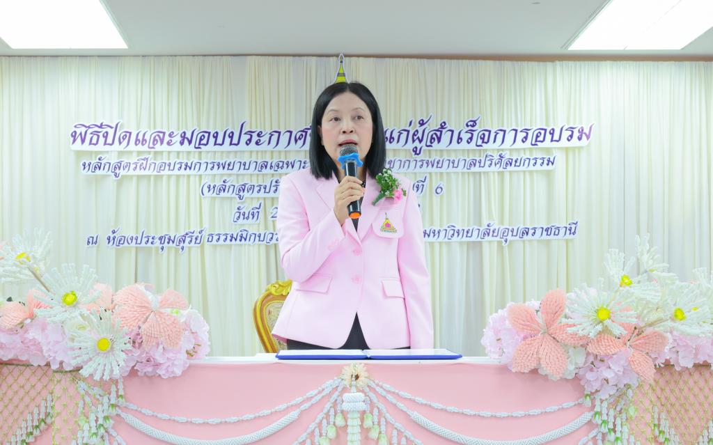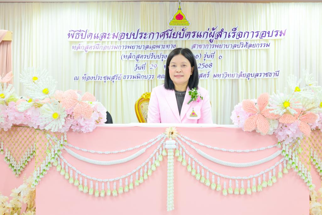 มหาวิทยาลัยอุบลราชธานี โดย คณะพยาบาลศาสตร์ จัดพิธีมอบใบประกาศนียบัตรแก่ผู้สำเร็จการอบรม หลักสูตรฝึกอบรมการพยาบาลเฉพาะทาง สาขาการพยาบาลปริศัลยกรรม (หลักสูตรปรับปรุง พ.ศ.2566) รุ่นที่ 6 โดยมี ผู้ช่วยศาสตราจารย์ ดร.สมลักษณ์ เทพสุริยานนท์ คณบดีคณะพยาบาลศาสตร์ เป็นประธาน และ ผู้ช่วยศาสตราจารย์ ดร.สุรชัย มณีเนตร รองคณบดีฝ่ายวิจัย บริการวิชาการ และวิเทศสัมพันธ์ กล่าวรายงาน มีผู้สำเร็จการอบรมจำนวน 43 คน จาก 36 โรงพยาบาล ของ 26 จังหวัด ทั่วประเทศ ณ ห้องประชุมสุรีย์ ธรรมิกบวร ชั้น 3 คณะพยาบาลศาสตร์ เมื่อวันที่ 29 พฤษภาคม 2568 ที่ผ่านมา