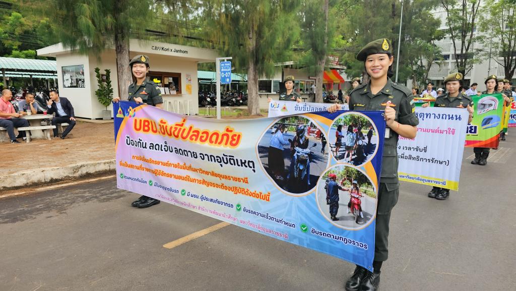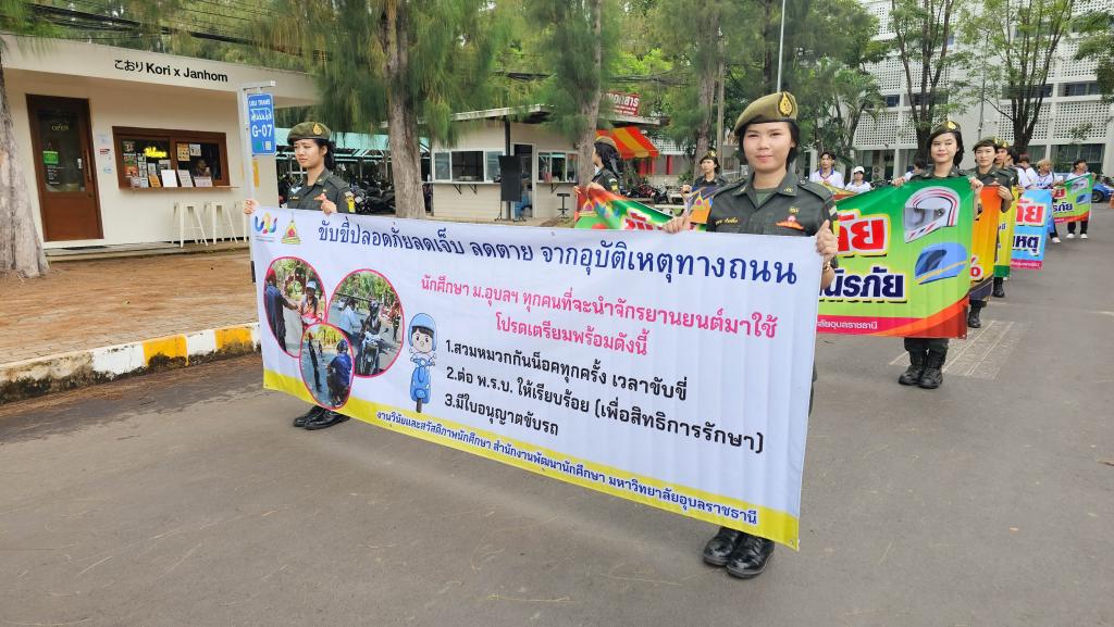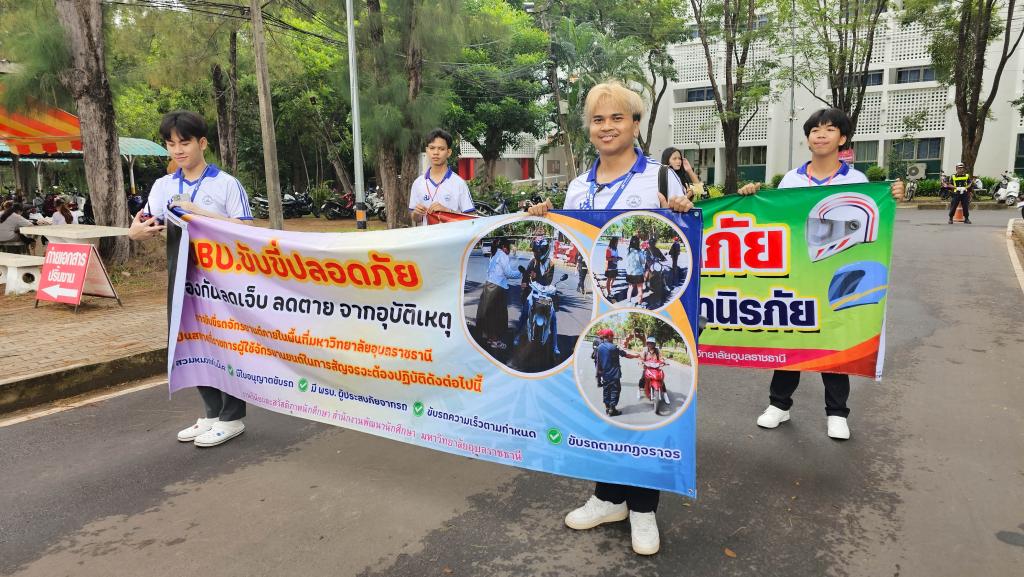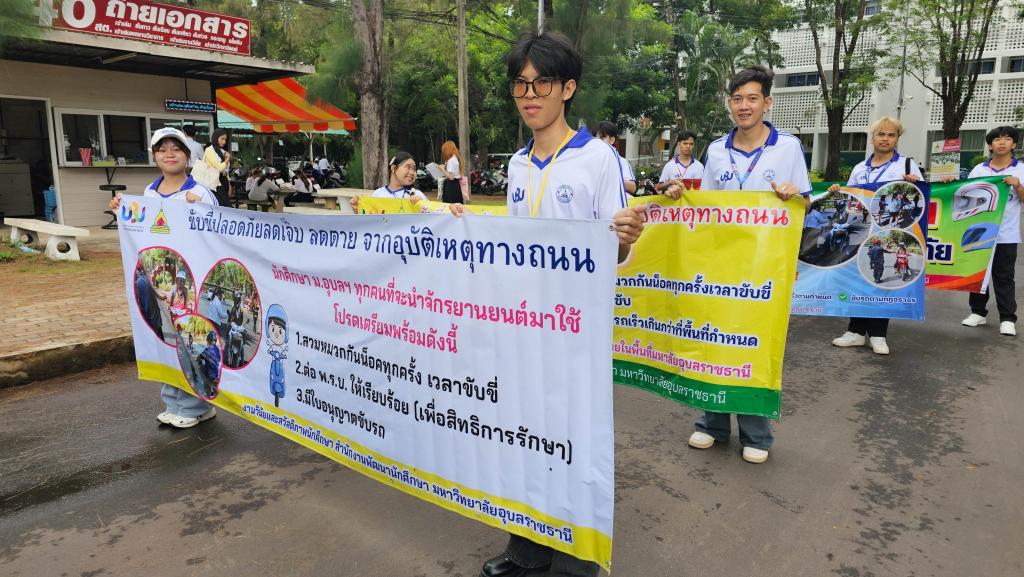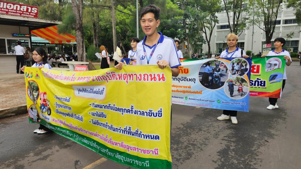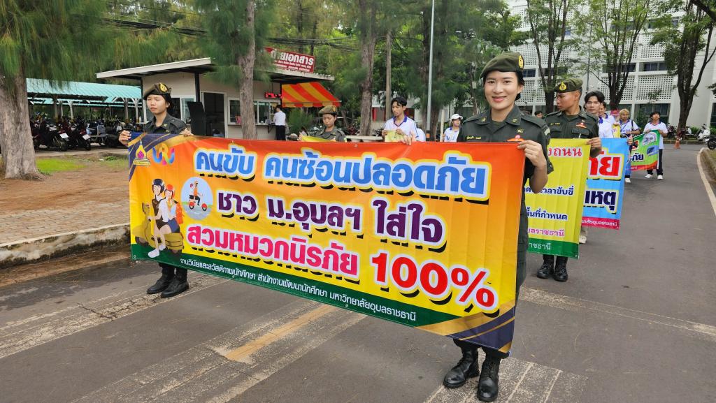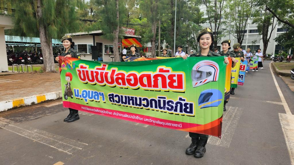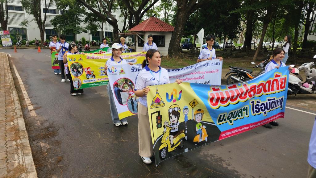 มหาวิทยาลัยอุบลราชธานี โดยสำนักงานพัฒนานักศึกษา จัดโครงการ “สร้างเสริมจิตสำนึกการขับขี่ปลอดภัย สำหรับนักศึกษา ประจำปี 2568” เพื่อส่งเสริมความปลอดภัยในการใช้รถใช้ถนนในหมู่นักศึกษา ภายในกิจกรรมประกอบด้วย ขบวนรถจักรยานยนต์รณรงค์การขับขี่ปลอดภัยพร้อมสวมหมวกนิรภัย 100% และการถือป้ายเดินรณรงค์ปลูกฝังจิตสำนึกปฏิบัติตามกฎจราจร โดยมี ผู้ช่วยศาสตราจารย์ ดร.ปรีชา บุญจูง รองอธิการบดีฝ่ายพัฒนานักศึกษาและศิษย์เก่าสัมพันธ์ เป็นประธานในพิธี นำบุคลากรและนักศึกษากว่า 200 คน ร่วมกิจกรรม ณ บริเวณหน้าอาคารเรียนรวม 5 ไปตามเส้นทางภายในมหาวิทยาลัย เมื่อวันที่ 6 มิถุนายน 2568 ที่ผ่านมา