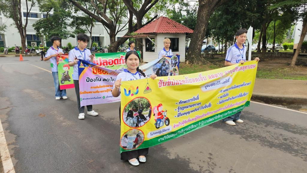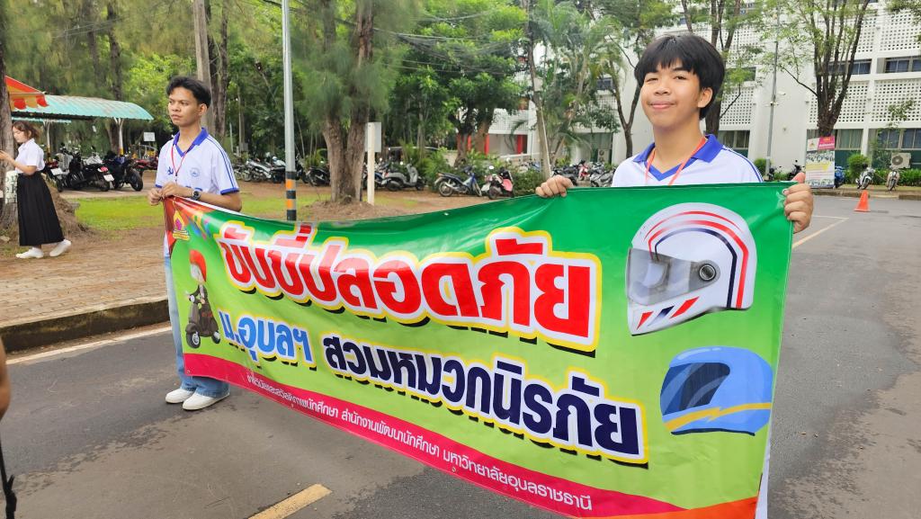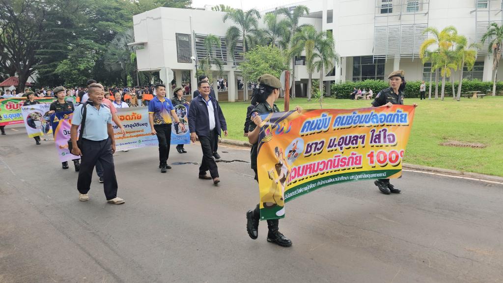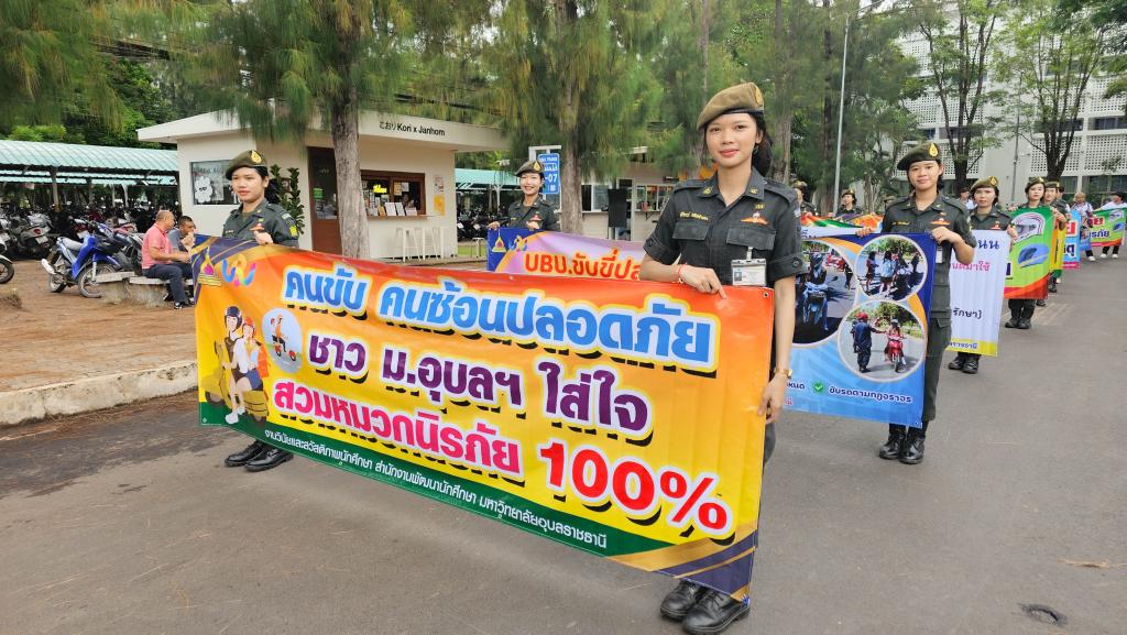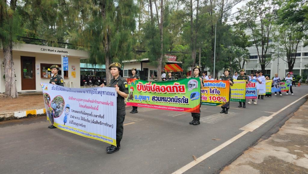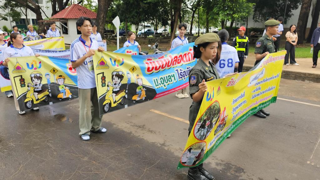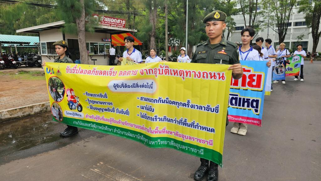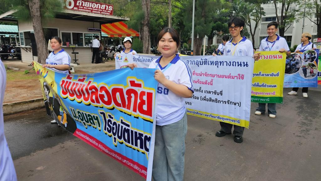 มหาวิทยาลัยอุบลราชธานี โดยสำนักงานพัฒนานักศึกษา จัดโครงการ “สร้างเสริมจิตสำนึกการขับขี่ปลอดภัย สำหรับนักศึกษา ประจำปี 2568” เพื่อส่งเสริมความปลอดภัยในการใช้รถใช้ถนนในหมู่นักศึกษา ภายในกิจกรรมประกอบด้วย ขบวนรถจักรยานยนต์รณรงค์การขับขี่ปลอดภัยพร้อมสวมหมวกนิรภัย 100% และการถือป้ายเดินรณรงค์ปลูกฝังจิตสำนึกปฏิบัติตามกฎจราจร โดยมี ผู้ช่วยศาสตราจารย์ ดร.ปรีชา บุญจูง รองอธิการบดีฝ่ายพัฒนานักศึกษาและศิษย์เก่าสัมพันธ์ เป็นประธานในพิธี นำบุคลากรและนักศึกษากว่า 200 คน ร่วมกิจกรรม ณ บริเวณหน้าอาคารเรียนรวม 5 ไปตามเส้นทางภายในมหาวิทยาลัย เมื่อวันที่ 6 มิถุนายน 2568 ที่ผ่านมา