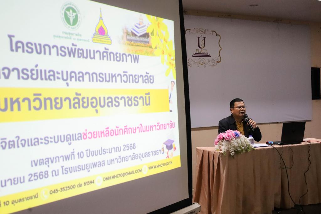 มหาวิทยาลัยอุบลราชธานี ร่วมกับ ศูนย์สุขภาพจิตที่ 10 อุบลราชธานี กรมสุขภาพจิต จัดการอบรมเชิงปฏิบัติการ "โครงการพัฒนาศักยภาพอาจารย์และบุคลากรมหาวิทยาลัย ในการดูแลจิตใจและระบบดูแลช่วยเหลือนักศึกษา" เพื่อถ่ายทอดความรู้ความเข้าใจ และทักษะเรื่องการสังเกตสัญญาณเตือนความเสี่ยงด้านสุขภาพจิต การประเมินสุขภาพจิตของนักศึกษา รวมถึงการให้ความช่วยเหลือสุขภาพจิตเบื้องต้น สำหรับอาจารย์ที่ปรึกษา และบุคลากร โดยมี ผู้ช่วยศาสตราจารย์ ดร.ปรีชา บุญจูง รองอธิการบดีฝ่ายพัฒนานักศึกษาและศิษย์เก่าสัมพันธ์ เป็นประธาน มีอาจารย์บุคลากรตัวแทนคณะหน่วยงาน เข้าร่วมการอบรมจำนวน 40 คน ซึ่งมี นางพัชรินทร์ วรรณุรักษ์ นักจิตวิทยาคลินิกชำนาญการ หัวหน้ากลุ่มงานวิชาการสุขภาพจิต และทีมบุคลากรจากศูนย์สุขภาพจิตที่ 10 อุบลราชธานี เป็นวิทยากร ณ ห้องประชุม ชั้น 1 โรงแรมยูเพลส วันที่ 23 มิถุนายน 2568