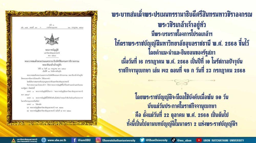 พระบาทสมเด็จพระปรเมนทรรามาธิบดีศรีสินทรมหาวชิราลงกรณ พระวชิรเกล้าเจ้าอยู่หัว มีพระบรมราชโองการโปรดเกล้าฯ ให้ตราพระราชบัญญัติมหาวิทยาลัยอุบลราชธานี พ.ศ. 2568 ขึ้นไว้ โดยคำแนะนำและยินยอมของรัฐสภา เมื่อวันที่ 16 กรกฎาคม พ.ศ. 2568 เป็นปีที่ 10 ในรัชกาลปัจจุบัน ราชกิจจานุเบกษา เล่ม 142 ตอนที่ 49 ก วันที่ 23 กรกฎาคม 2568 โดยพระราชบัญญัติจะมีผลใช้บังคับเมื่อพ้น 90 วัน นับแต่วันประกาศในราชกิจจานุเบกษา คือ ตั้งแต่วันที่ 22 ตุลาคม พ.ศ. 2568 เป็นต้นไป ทั้งนี้เป็นไปตามบทบัญญัติในมาตรา 2 แห่งพระราชบัญญัติฯ