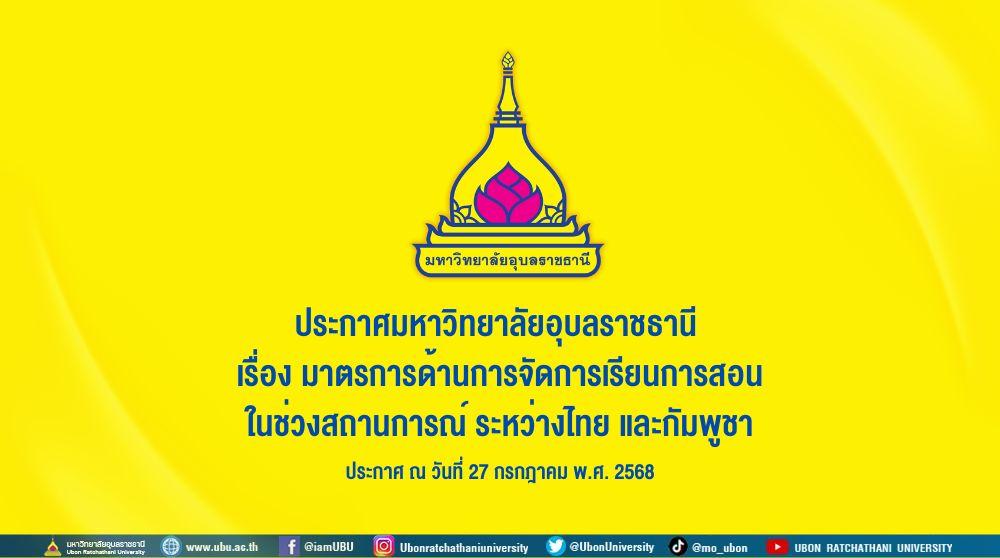ด้วยสถานการณ์ความตึงเครียดระหว่างไทยและกัมพูชายังคงดำเนินอยู่ และอาจส่งผลกระทบต่อความปลอดภัยในการดำรงชีวิตของนักศึกษาและบุคลากรของมหาวิทยาลัย อันเป็นสิ่งที่มหาวิทยาลัยอุบลราชธานีให้ความสำคัญสูงสุด ดังนั้นเพื่อให้เกิดความปลอดภัยต่อสวัสดิภาพของประชาคมมหาวิทยาลัยอุบลราชธานี และประชาชนในพื้นที่ มหาวิทยาลัยอุบลราชธานี จึงออกมาตรการด้านการจัดการเรียนการสอนในช่วงสถานการณ์ดังกล่าว จนกว่าสถานการณ์จะคลี่คลายเข้าสู่ภาวะปกติ ดังต่อไปนี้