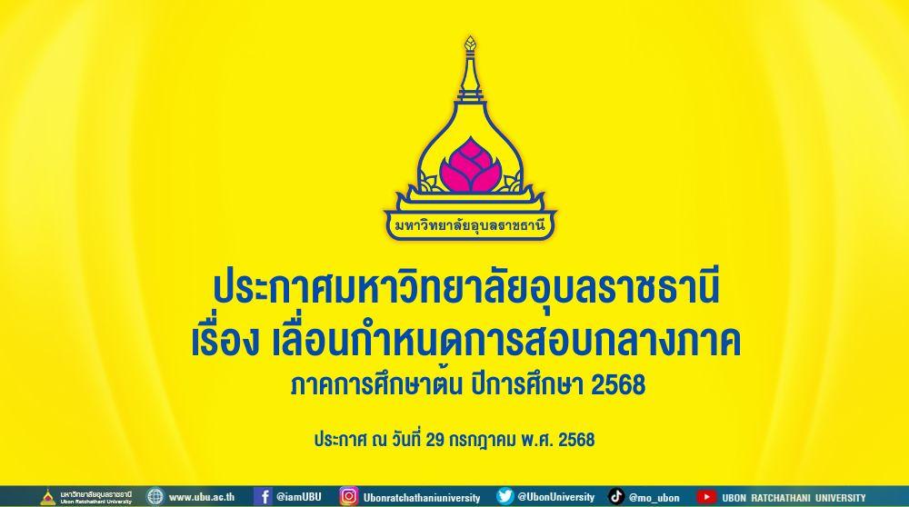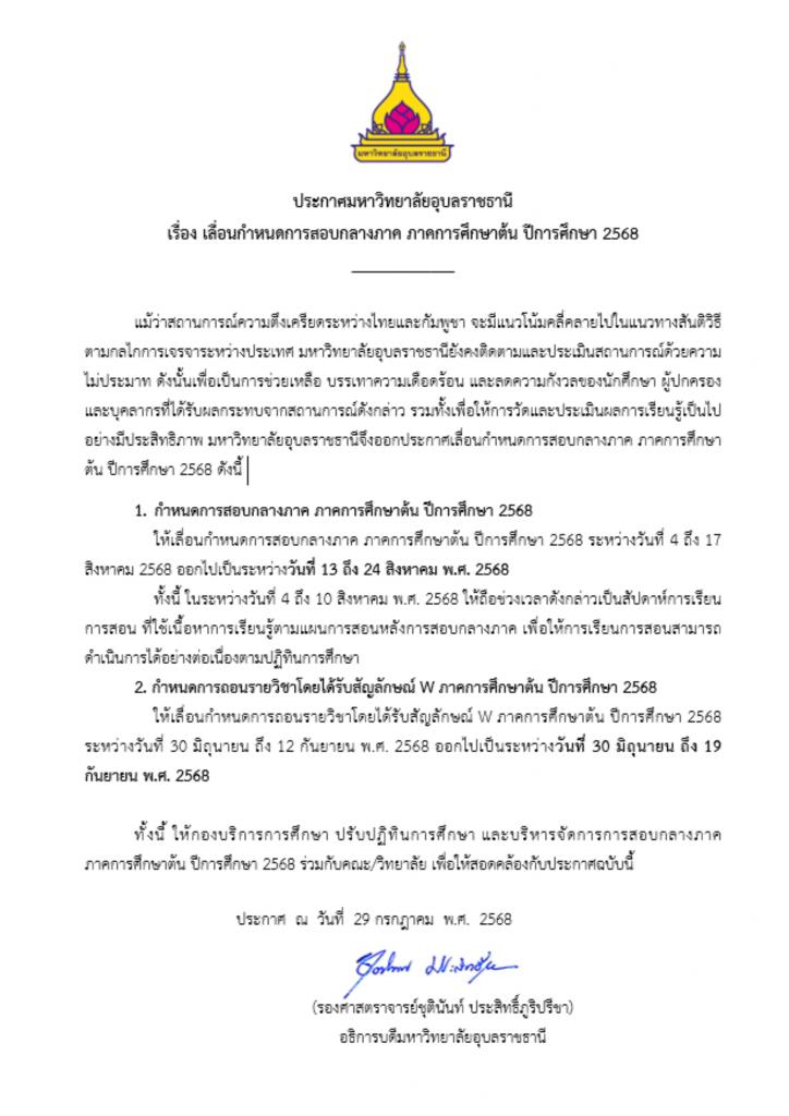 แม้ว่าสถานการณ์ความตึงเครียดระหว่างไทยและกัมพูชา จะมีแนวโน้มคลี่คลายไปในแนวทางสันติวิธีตามกลไกการเจรจาระหว่างประเทศ มหาวิทยาลัยอุบลราชธานียังคงติดตามและประเมินสถานการณ์ด้วยความไม่ประมาท ดังนั้นเพื่อเป็นการช่วยเหลือ บรรเทาความเดือดร้อน และลดความกังวลของนักศึกษา ผู้ปกครอง และบุคลากรที่ได้รับผลกระทบจากสถานการณ์ดังกล่าว รวมทั้งเพื่อให้การวัดและประเมินผลการเรียนรู้เป็นไปอย่างมีประสิทธิภาพ มหาวิทยาลัยอุบลราชธานีจึงออกประกาศเลื่อนกำหนดการสอบกลางภาค ภาคการศึกษาต้น ปีการศึกษา 2568ดังนี้