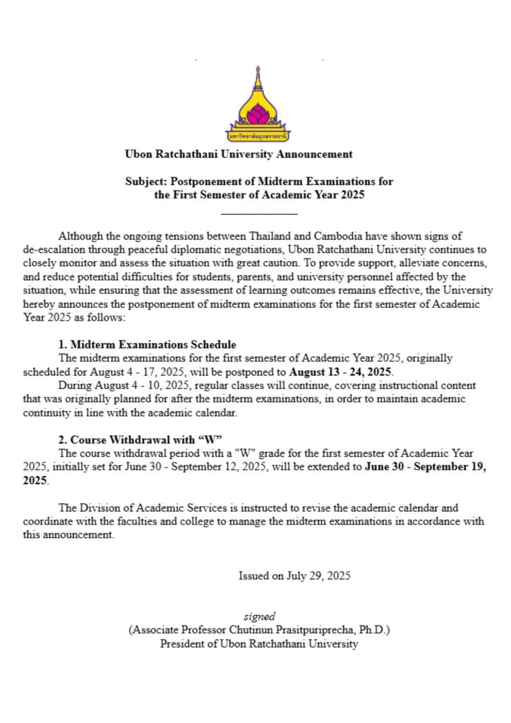 Although the ongoing tensions between Thailand and Cambodia have shown signs of de-escalation through peaceful diplomatic negotiations, Ubon Ratchathani University continues to closely monitor and assess the situation with great caution. To provide support, alleviate concerns, and reduce potential difficulties for students, parents, and university personnel affected by the situation, while ensuring that the assessment of learning outcomes remains effective, the University hereby announces the postponement of midterm examinations for the first semester of Academic Year 2025 as follows: