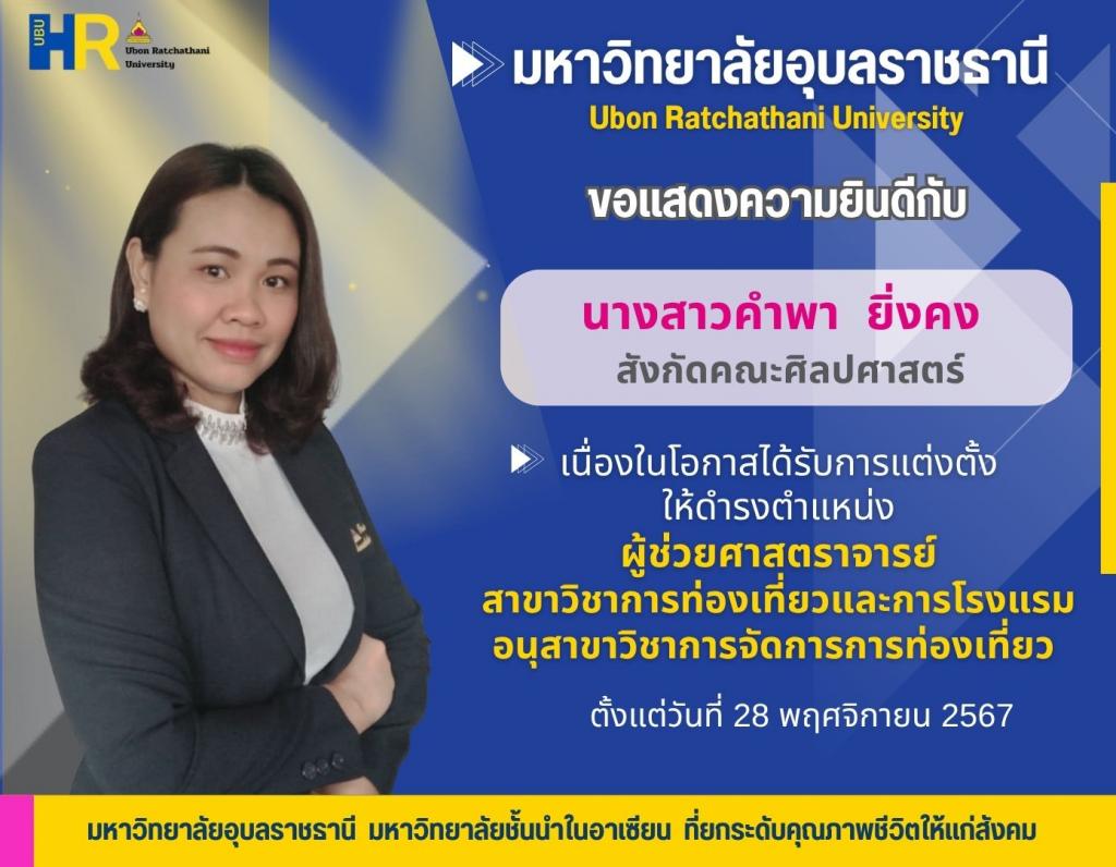 1. นางสาวคำพา ยิ่งคง พนักงานมหาวิทยาลัย ตำแหน่งอาจารย์ สังกัดสำนักงานเลขานุการ คณะศิลปศาสตร์ ดำรงตำแหน่งผู้ช่วยศาสตราจารย์ สาขาวิชาการท่องเที่ยวและการโรงแรม อนุสาขาวิชาการจัดการการท่องเที่ยว ตั้งแต่วันที่ 28 พฤศจิกายน 2567ซึ่งเป็นวันที่ฝ่ายเลขานุการคณะกรรมการพิจารณาตำแหน่งทางวิชาการได้รับเรื่อง
