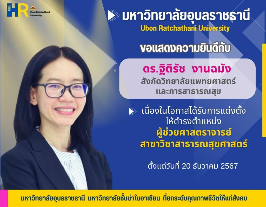 2. นางสาวฐิติรัช งานฉมัง พนักงานมหาวิทยาลัย ตำแหน่งอาจารย์สังกัดกลุ่มวิชาสาธารณสุขศาสตร์ วิทยาลัยแพทยศาสตร์และการสาธารณสุข ดำรงตำแหน่งผู้ช่วยศาสตราจารย์ สาขาวิชาสาธารณสุขศาสตร์ ตั้งแต่วันที่ 20 ธันวาคม 2567 ซึ่งเป็นวันที่ฝ่ายเลขานุการคณะกรรมการพิจารณาตำแหน่งทางวิชาการได้รับเรื่อง