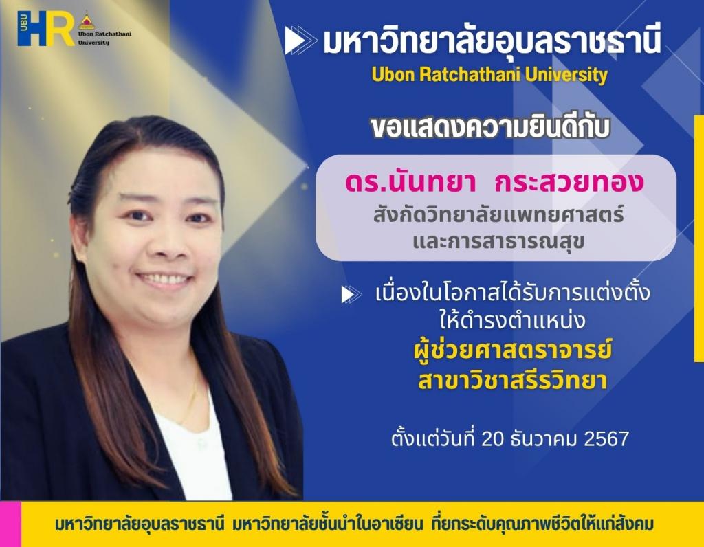 3.นางสาวนันทยา กระสวยทอง พนักงานมหาวิทยาลัย ตำแหน่งอาจารย์สังกัดกลุ่มวิชาแพทยศาสตร์ วิทยาลัยแพทยศาสตร์และการสาธารณสุข ดำรงตำแหน่งผู้ช่วยศาสตราจารย์ สาขาวิชาสรีรวิทยา ตั้งแต่วันที่ 20 ธันวาคม 2567 ซึ่งเป็นวันที่ฝ่ายเลขานุการคณะกรรมการพิจารณาตำแหน่งทางวิชาการได้รับเรื่อง