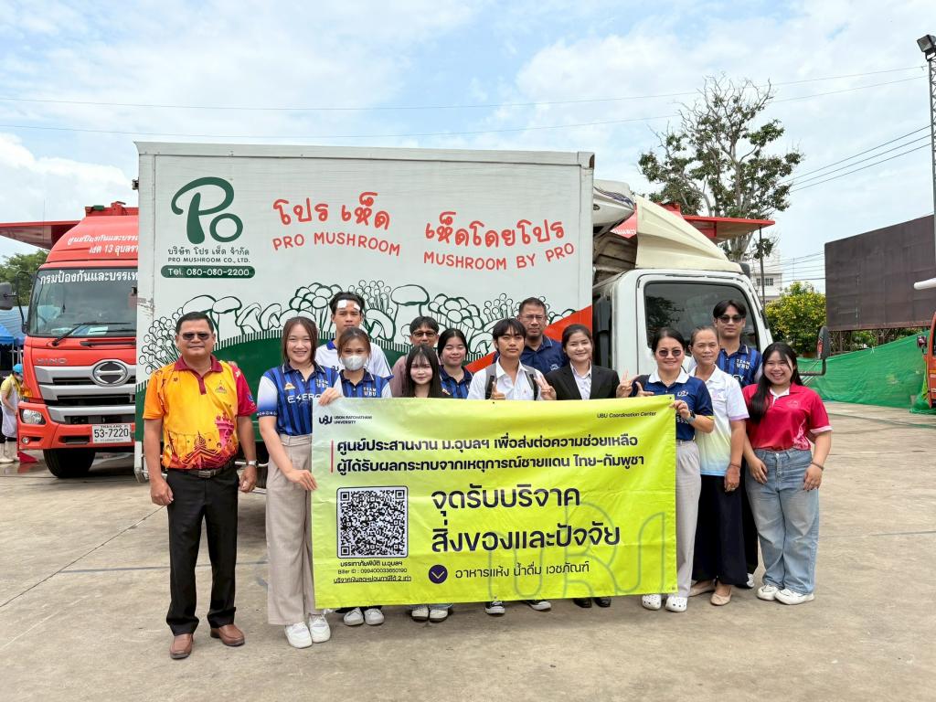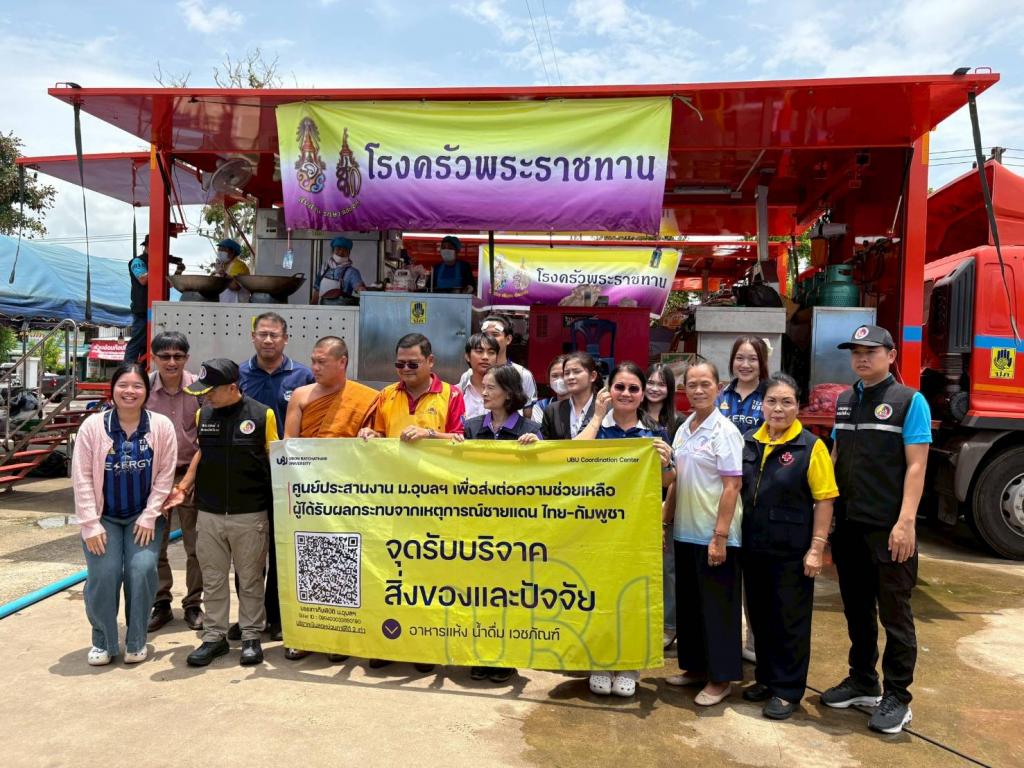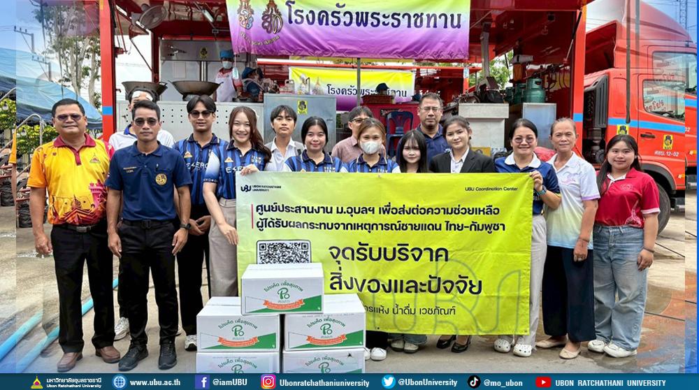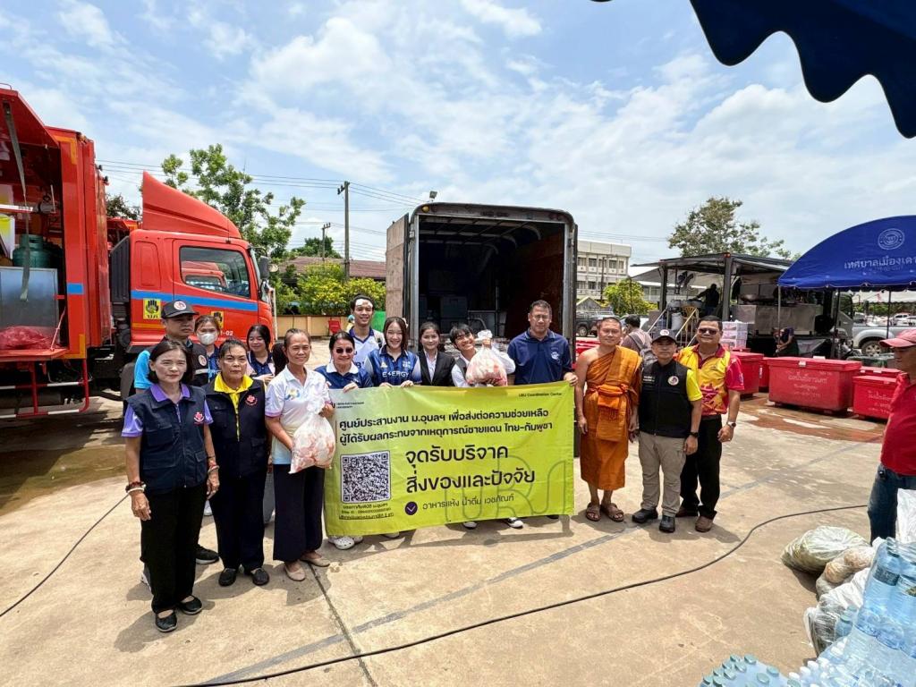 ศูนย์ประสานงาน ม.อุบลฯ ศูนย์ประสานงาน ม.อุบลฯ เพื่อส่งต่อความช่วยเหลือผู้ได้รับผลกระทบจากเหตุการณ์ชายแดนไทย-กัมพูชา (UBU Coordination Center : UBU COC) เร่งเดินหน้าปฏิบัติภารกิจให้ความช่วยเหลือผู้ได้รับผลกระทบจากเหตุการณ์ความไม่สงบชายแดนไทย-กัมพูชา โดยมี ผู้ช่วยศาสตราจารย์ ดร.ปรีชา บุญจูง รองอธิการบดีฝ่ายพัฒนานักศึกษาและศิษย์เก่าสัมพันธ์ พร้อมด้วย ศาสตราจารย์ ดร.ทวนทอง จุฑาเกตุ รองอธิการบดีฝ่ายวิจัยและนวัตกรรม นำบุคลากร นักศึกษาจิตอาสาร่วมส่งมอบสิ่งของบริจาค แก่ศูนย์อพยพและมอบยาและเวชภัณฑ์ ให้กับศูนย์พักพิงผู้ป่วยเปราะบาง และจัดซื้อวัตถุดิบสำหรับประกอบอาหารโรงครัวพระราชทาน ในพื้นที่อำเภอเดชอุดม จังหวัดอุบลราชธานี