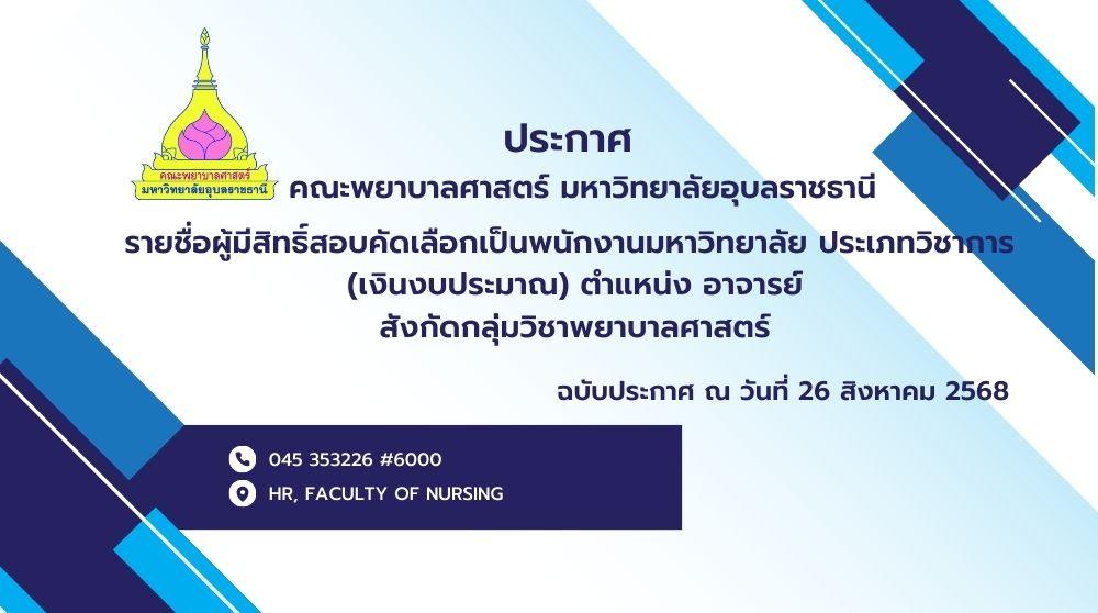 ตามประกาศคณะพยาบาลศาสตร์ เรื่อง รับสมัครบุคคลเพื่อคัดเลือกเป็นพนักงานมหาวิทยาลัย เงินงบประมาณ ตำแหน่ง อาจารย์ จำนวน 1 อัตรา สังกัดกลุ่มวิชาพยาบาลศาสตร์ คณะพยาบาลศาสตร์ ฉบับลงวันที่ 6 พฤษภาคม พ.ศ. 2568 ประกอบกับประกาศคณะพยาบาลศาสตร์ มหาวิทยาลัยอุบลราชธานี เรื่อง ขยายเวลารับสมัครบุคคลเพื่อคัดเลือกเป็นพนักงานมหาวิทยาลัย ประเภทวิชาการ (เงินงบประมาณ) ตำแหน่ง อาจารย์ สังกัด กลุ่มวิชาพยาบาลศาสตร์ คณะพยาบาลศาสตร์ (ครั้งที่ 3) ฉบับลงวันที่ 29 กรกฎาคม พ.ศ. 2568 นั้น
