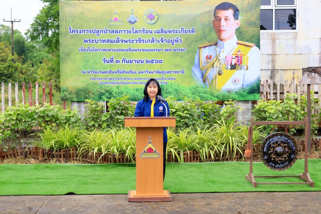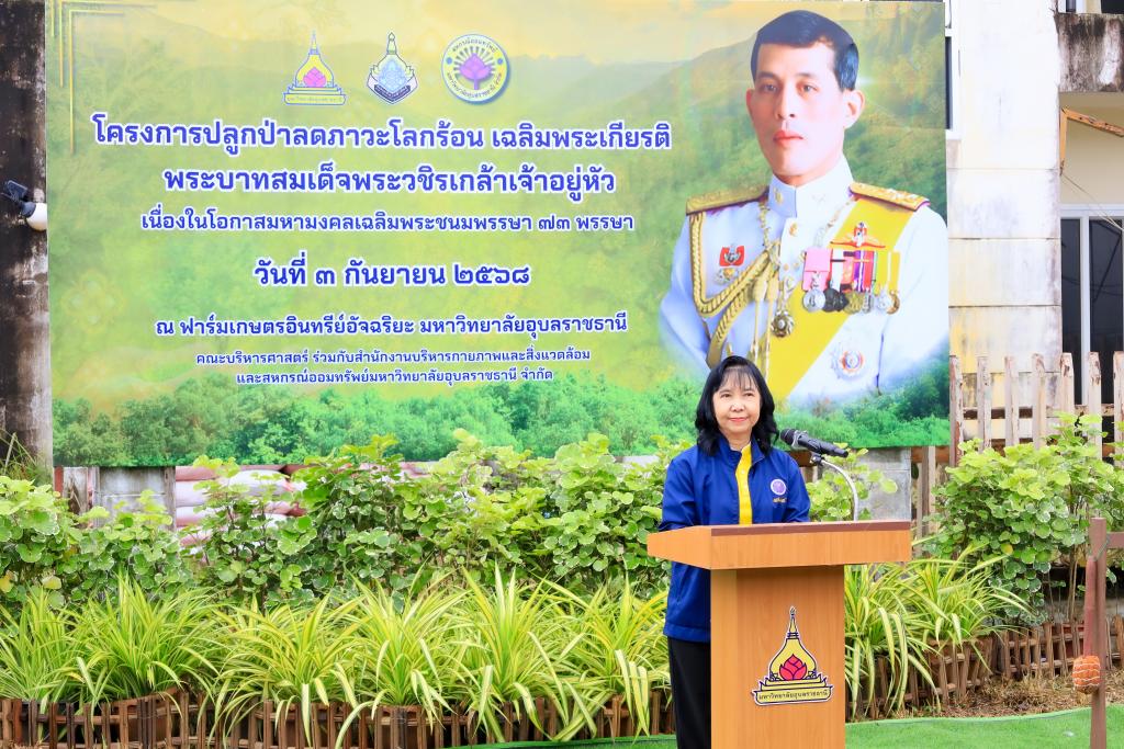 มหาวิทยาลัยอุบลราชธานี โดย คณะบริหารศาสตร์ จัดโครงการปลูกป่าลดภาวะโลกร้อน เฉลิมพระเกียรติ พระบาทสมเด็จพระวชิรเกล้าเจ้าอยู่หัว เนื่องในโอกาสมหามงคลเฉลิมพระชนมพรรษา 73พรรษา โดยมี รศ.ดร.ชุตินันท์ ประสิทธิ์ภูริปรีชา อธิการบดีมหาวิทยาลัยอุบลราชธานี เป็นประธานในพิธีเปิด ผศ.ดร.อุทัย อันพิมพ์ คณบดีคณะบริหารศาสตร์ กล่าวรายงานวัตถุประสงค์การจัดงาน โดยมี คณะผู้บริหาร บุคลากร นักศึกษา ภาคีเครือข่าย จาก เทศบาลตำบลเมืองศรีไคเทศบาลตำบลคำขวางองค์การบริหารส่วนตำบลโพธิ์ใหญ่บมจ.ศรีตรังฯ อุบลราชธานีเข้าร่วมโครงการเป็นจำนวนมาก เมื่อวันพุธที่ 3กันยายน 2568ณ ฟาร์มเกษตรอินทรีย์อัจฉริยะ มหาวิทยาลัยอุบลราชธานี
