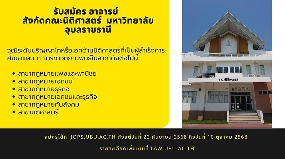 ประกาศคณะนิติศาสตร์ มหาวิทยาลัยอุบลราชธานี เรื่อง รับสมัครสอบคัดเลือกบุคคลเพื่อบรรจุและแต่งตั้งเป็นพนักงานมหาวิทยาลัย (เงินรายได้) ตำแหน่ง อาจารย์ สังกัดคณะนิติศาสตร์ มหาวิทยาลัยอุบลราชธานี