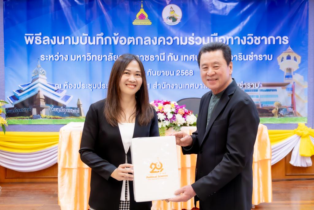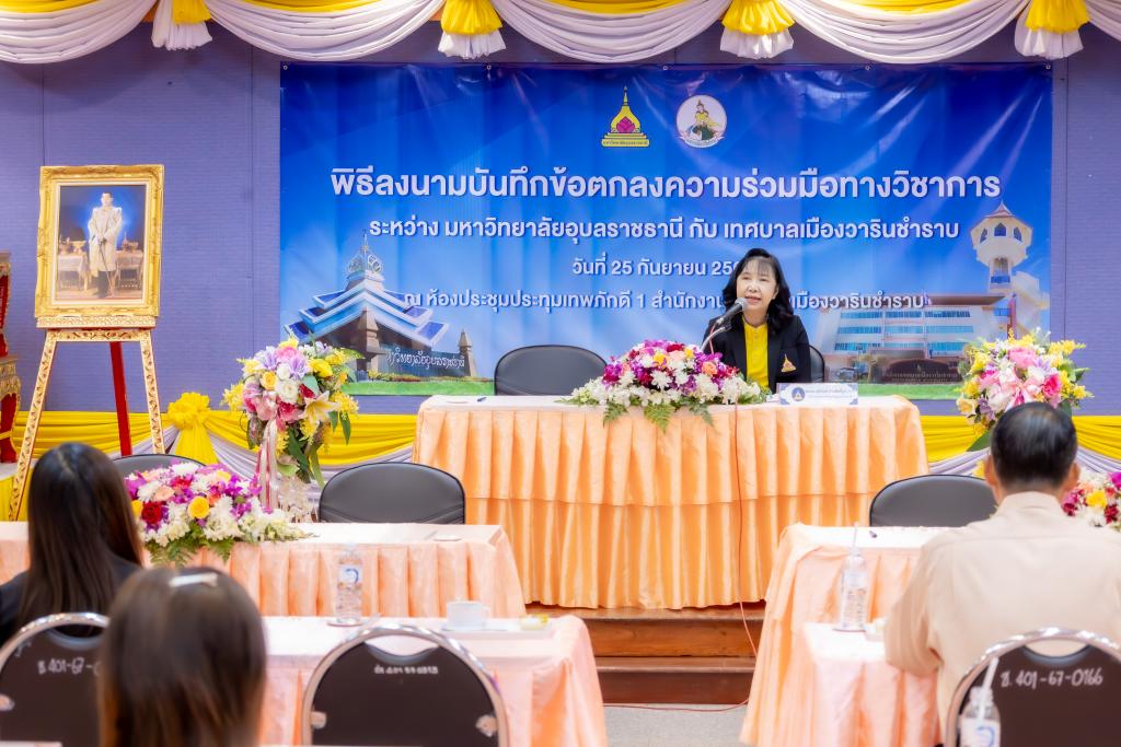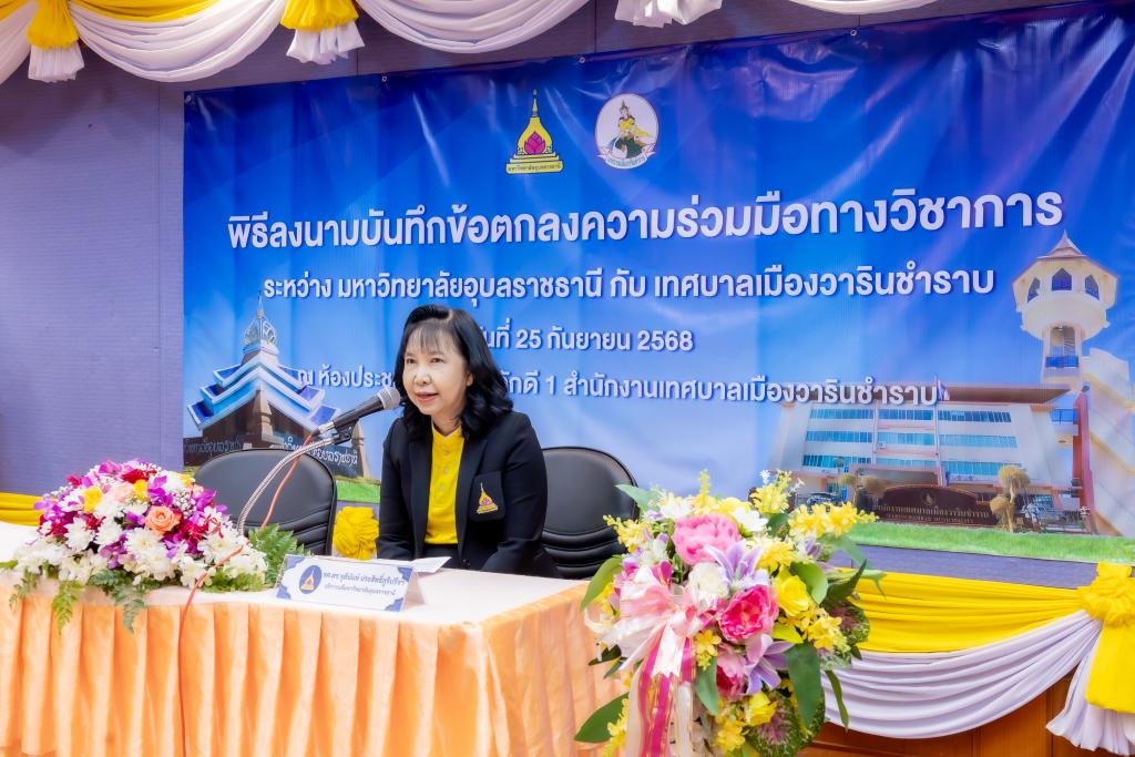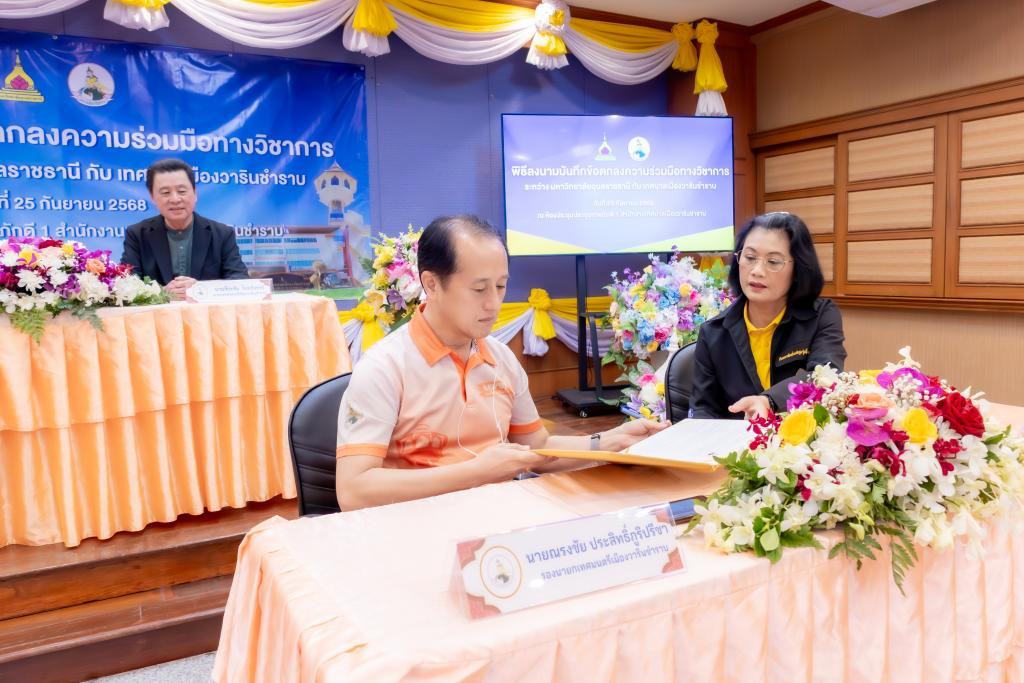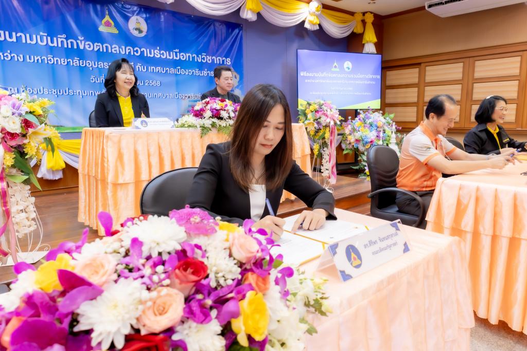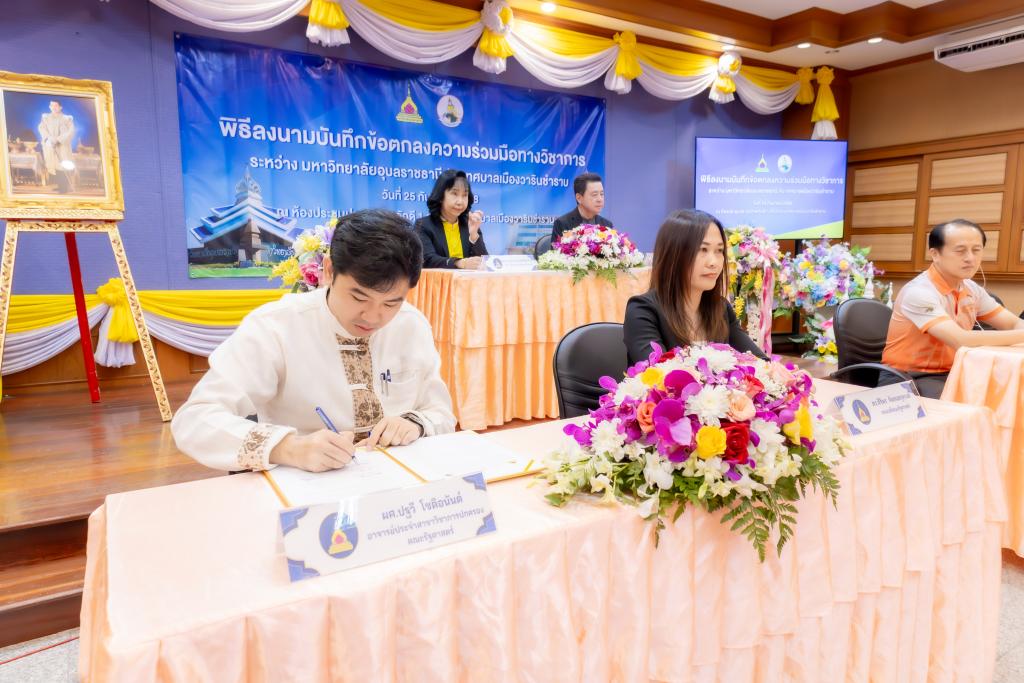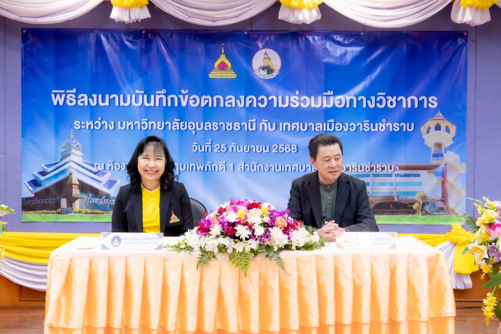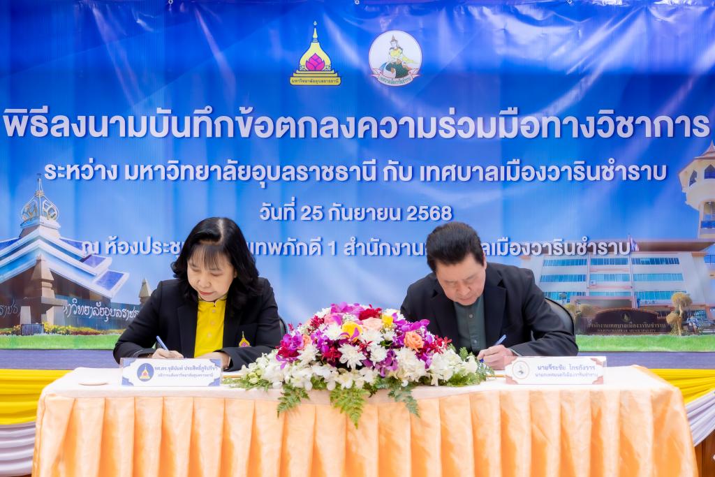 มหาวิทยาลัยอุบลราชธานี และ คณะรัฐศาสตร์ โดย รองศาสตราจารย์ชุตินันท์ ประสิทธิ์ภูริปรีชา อธิการบดี พร้อมด้วย นายจีระชัยไกรกังวาร ตำแหน่ง นายกเทศมนตรีเมืองวารินชำราบ ร่วมลงนามในบันทึกข้อตกลง (MOU) ร่วมมือทางวิชาการ ระหว่าง มหาวิทยาลัยอุบลราชธานี กับ เทศบาลเมืองวารินชำราบ อำเภอวารินชำราบ จังหวัดอุบลราชธานี โดยมี ผศ.ปฐวี โชติอนันต์ อาจารย์ประจำคณะรัฐศาสตร์ กล่าวรายงานความเป็นมาในการจัดทำบันทึกข้อตกลงความร่วมมือทางวิชาการ (MOU) ดังกล่าว พร้อมนี้ ดร.ศิริพร จันทนสกุลวงศ์ คณบดีคณะรัฐศาสตร์ ได้ร่วมเป็นเกียรติและลงนามเป็นสักขีพยานในบันทึกข้อตกลง ในครั้งนี้ เมื่อวันพฤหัสบดีที่ 25 กันยายน 2568 ณ ห้องประชุมประทุมเทพภักดี เทศบาลเมืองวารินชำราบ อำเภอวารินชำราบ จังหวัดอุบลราชธานี