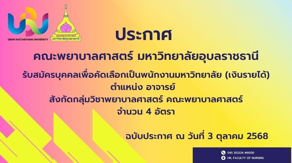 ด้วยคณะพยาบาลศาสตร์ มหาวิทยาลัยอุบลราชธานี มีความประสงค์จะรับสมัครสอบคัดเลือกบุคคลเป็นพนักงานมหาวิทยาลัย เงินรายได้ ตำแหน่ง อาจารย์ จำนวน 4 อัตรา (เลขที่ตำแหน่ง 13, 23, 604 และ707) เพื่อปฏิบัติงานในสังกัด กลุ่มวิชาพยาบาลศาสตร์ คณะพยาบาลศาสตร์ มหาวิทยาลัยอุบลราชธานี