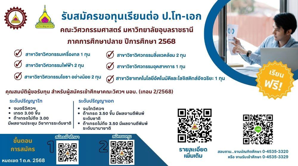 ตามที่คณะอนุกรรมการทุนการศึกษาระดับบัณฑิตศึกษา คณะวิศวกรรมศาสตร์ ประกาศรายชื่อผู้มีสิทธิ์สอบคัดเลือกขอรับรับทุนการศึกษา คณะวิศวกรรมศาสตร์ ประจำปีการศึกษา 2568 (ภาคการศึกษาปลาย ปีการศึกษา 2568) บัดนี้ การสอบคัดเลือกผู้ได้รับทุนการศึกษาได้ดำเนินการเสร็จสิ้นแล้ว จึงประกาศรายชื่อผู้ได้รับทุนการศึกษา โดยมีรายละเอียดตามไฟล์ที่แนบ