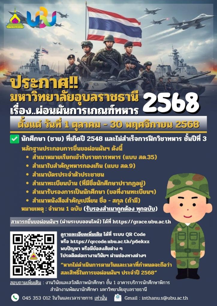 ????????? งานวินัยและสวัสดิภาพนักศึกษา สำนักงานพัฒนานักศึกษา มหาวิทยาลัยอุบลราชธานี ประกาศ...นักศึกษา(ชาย) ที่เกิดปี พ.ศ. 2548 หรืออายุครบ 20 ปีบริบูรณ์ หรือนักศึกษาที่ยื่นผ่อนผันฯ กับสถานศึกษาเดิม และย้ายมาศึกษาที่มหาวิทยาลัยอุบลราชธานี ยกเว้นผู้เรียนจบนักศึกษาวิชาทหาร ชั้นปีที่ 3 ไม่ต้องยื่นเรื่องขอผ่อนผันการเกณฑ์ทหาร และนักศึกษาที่มีความประสงค์ ?ผ่อนผันการเกณฑ์ทหาร 2568? สามารถยื่นขอผ่อนผันการเกณฑ์ทหาร ผ่านเว็บไซต์?https://grace.ubu.ac.th.ระหว่างวันที่ 1 ตุลาคม ? 30 พฤศจิกายน 2568หรือติดต่อสอบถามรายละเอียดเพิ่มเติมได้ที่ E ? mail inthanu.s@ubu.ac.th โทรศัพท์ 045 353 012 หรือติดต่อด้วยตนเองได้ที่ งานวินัยและสวัสดิภาพนักศึกษา ชั้น 1 อาคารบริการนักศึกษาพิการ อาคารสีเขียวชั้นเดียว ระหว่างอาคารสำนักงานอธิการบดี 1 และ 2??