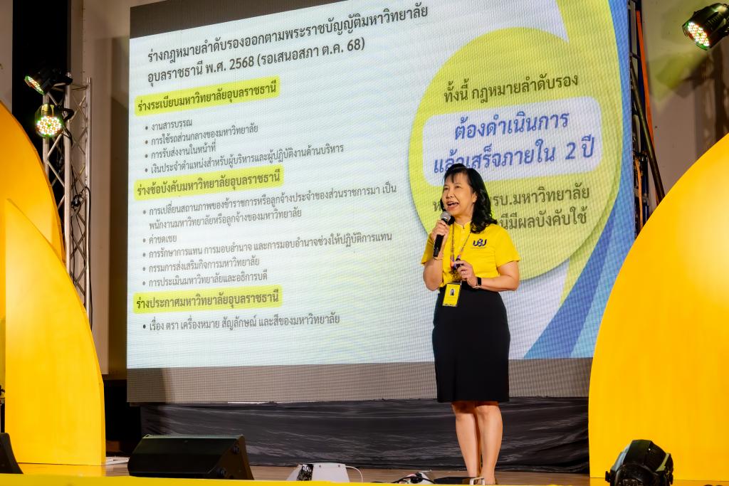 วันที่ 22 ตุลาคม 2568 มหาวิทยาลัยอุบลราชธานี Kick Off สู่การเป็นมหาวิทยาลัยในกำกับของรัฐ โดยจัดงาน “UBU Brighten the Future Together – ก้าวสู่ยุคใหม่ มหาวิทยาลัยอุบลราชธานี” เพื่อเฉลิมฉลองการเปลี่ยนผ่านครั้งสำคัญอย่างเป็นทางการ ภายใต้ พระราชบัญญัติมหาวิทยาลัยอุบลราชธานี พ.ศ. 2568 ซึ่งมีผลบังคับนับตั้งแต่วันที่ 22 ตุลาคม 2568 เป็นต้นไป ถือเป็นก้าวสำคัญในการยกระดับการบริหารจัดการมหาวิทยาลัยสู่ความคล่องตัว เข้มแข็ง และยั่งยืน โดยมี รองศาสตราจารย์ ดร.ชุตินันท์ ประสิทธิ์ภูริปรีชา อธิการบดี เป็นประธาน พร้อมนำคณะผู้บริหาร คณาจารย์ บุคลากร และนักศึกษากว่า 500 คน ร่วมเป็นส่วนหนึ่งของ “การเปลี่ยนผ่านครั้งสำคัญ ของมหาวิทยาลัยอุบลราชธานี สู่การเป็นมหาวิทยาลัยในกำกับของรัฐ” ณ โรงแรมยูเพลส มหาวิทยาลัยอุบลราชธานี