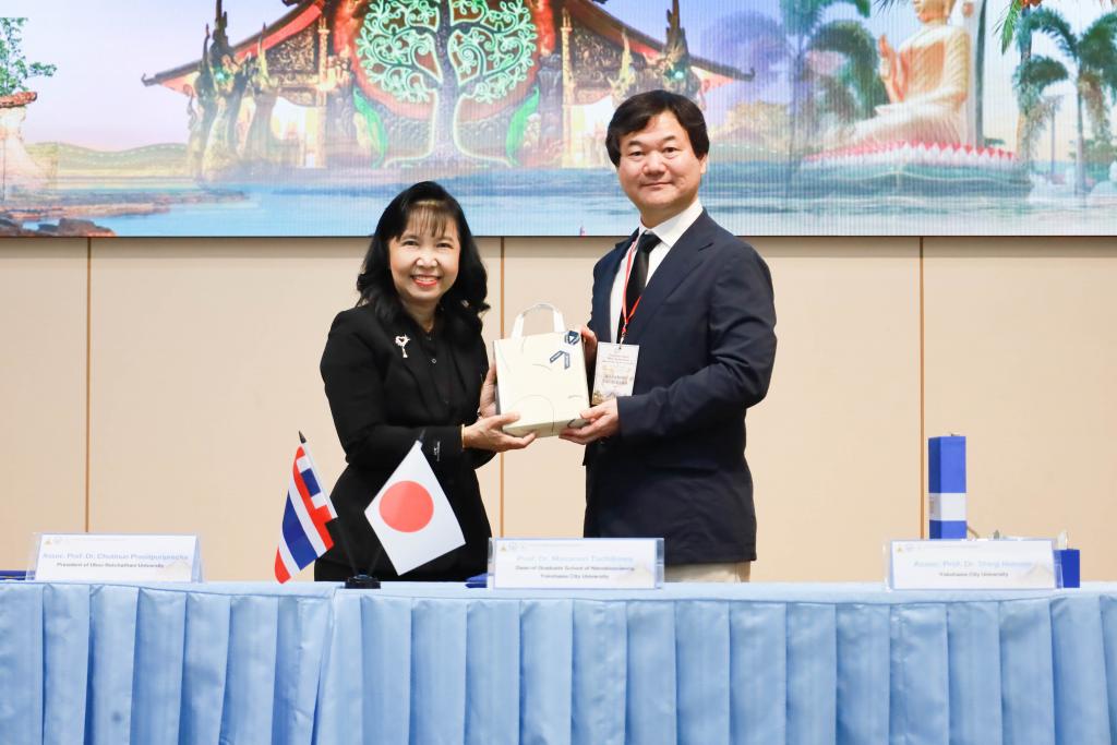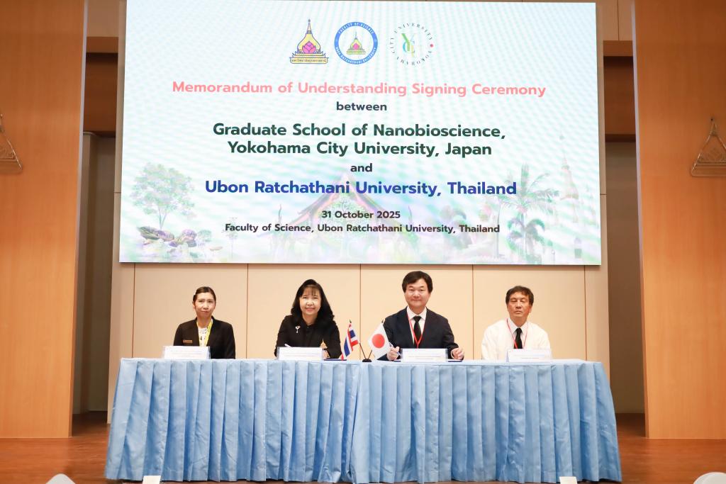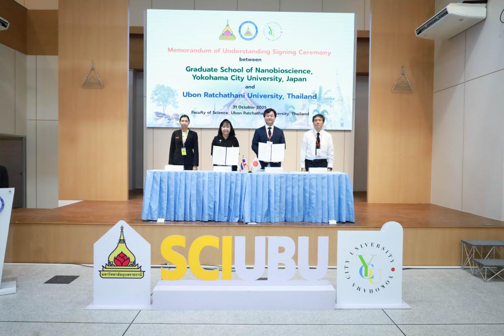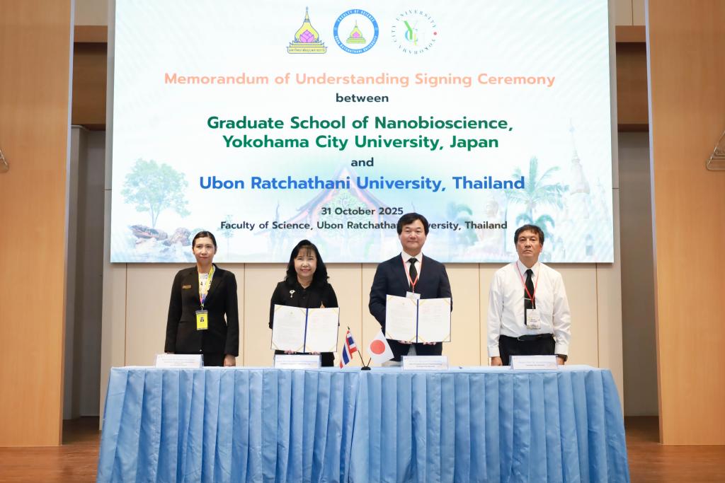 ในโอกาสเดียวกันนี้ มหาวิทยาลัยอุบลราชธานี และ Yokohama City University ร่วมลงนามในบันทึกข้อตกลงความร่วมมือทางวิชาการ (MOU) โดยมี รองศาสตราจารย์ ดร.ชุตินันท์ ประสิทธิภูริปรีชา อธิการบดี มหาวิทยาลัยอุบลราชธานี และ Prof. Dr.Masanori Tachikawa จาก Yokohama City University ร่วมลงนามเพื่อส่งเสริมการศึกษา การแลกเปลี่ยนนักศึกษาและนักวิจัย และพัฒนางานวิจัยร่วมกันในด้านวัสดุศาสตร์ (Materials Science) ด้านนาโนเทคโนโลยี (Nanotechnology) ด้านพลังงานสะอาด (Clean Energy) และด้านระบบตรวจวัดอัจฉริยะ (Intelligent Sensing) ซึ่งเป็นกลไกสำคัญในการขับเคลื่อนกลุ่มวิจัย “Innovation in Materials Science and Sensor Technology for Sustainable Quality of Life” เพื่อบรรลุเป้าหมายการพัฒนาที่ยั่งยืน (Sustainability) และ Net-Zero Energy