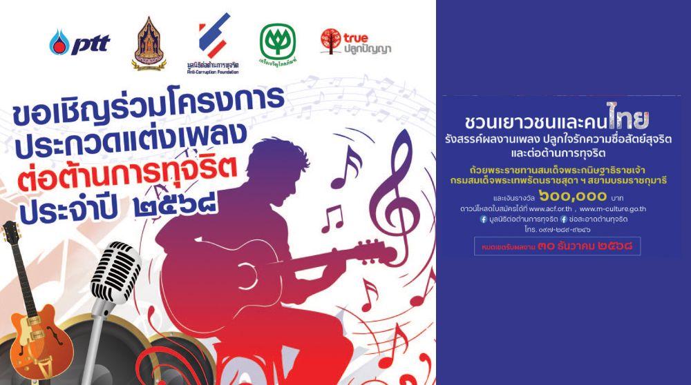 มูลนิธิต่อต้านการทุจริต ร่วมกับ กระทรวงวัฒนธรรม เครือเจริญโภคภัณฑ์ และทรูปลูกปัญญาชวนเยาวชน และคนไทย ประกวดแต่งเพลงต่อต้านการทุจริต ประจำปี 2568 ถ้วยพระราชทานสมเด็จพระกนิษฐาธิราชเจ้ากรมสมเด็จพระเทพรัตนราชสุดา ฯ สยามบรมราชกุมารีและเงินรางวัล 600,000 บาท