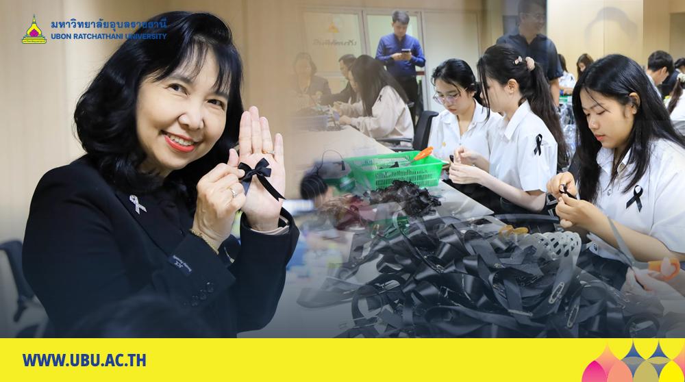 โครงการนี้ โดยความร่วมมือ มหาวิทยาลัยอุบลราชธานี และองค์การนักศึกษาจัดขึ้น และขอเชิญชวนนักศึกษา บุคลากร และประชาชนทั่วไป ร่วมจิตอาสาประดิษฐ์ริบบิ้นสัญลักษณ์แสดงความอาลัย จำนวน 30,000 ชิ้น ซึ่งจัดทำจากวัสดุที่มีความหมายอันลึกซึ้ง โดยใช้ริบบิ้นผ้าสีดำ ซึ่งสื่อถึงความอาลัยและความบริสุทธิ์แห่งความจงรักภักดี เพื่อสื่อถึงความสง่างามและความเคารพสูงสุด พร้อมนำแจกจ่ายให้นักศึกษา บุคลากร ตลอดจนบัณฑิตและญาติที่จะเดินทางมาร่วมงาพิธีพระราชทานปริญญาบัตร ได้สวมใส่แสดงความอาลัยร่วมกัน ทั้งนี้ “ริบบิ้นสัญลักษณ์แสดงความอาลัย” หรือ Black Ribbon มีที่มาจากธรรมเนียมปฏิบัติของชาวตะวันตก ซึ่งเดิมนิยมสวมใส่ชุดสีดำทั้งชุดหรือปลอกแขนสีดำ เพื่อแสดงความไว้ทุกข์หรือไว้อาลัยแก่ผู้วายชนม์ ต่อมามีการปรับเปลี่ยนรูปแบบให้เหมาะสมกับสภาพสังคม โดยเฉพาะในกลุ่มผู้ปฏิบัติหน้าที่สวมเครื่องแบบ เช่น ทหาร ตำรวจ หรือข้าราชการ จึงได้ประดิษฐ์ “ริบบิ้นสีดำ” ขนาดเล็กไว้ประดับแทนชุดดำ เพื่อแสดงความอาลัยอย่างสุภาพ เรียบง่าย และสะดวกในการสวมใส่ จนกลายเป็นสัญลักษณ์ที่ใช้กันอย่างแพร่หลายทั่วโลก