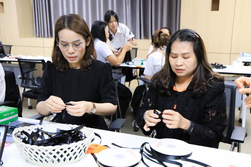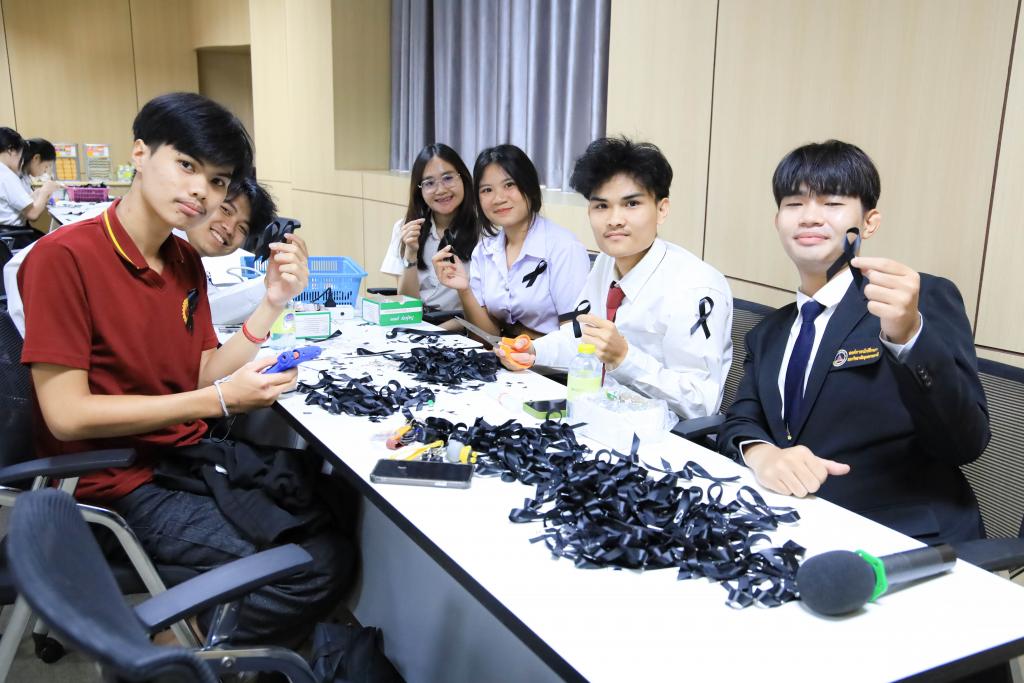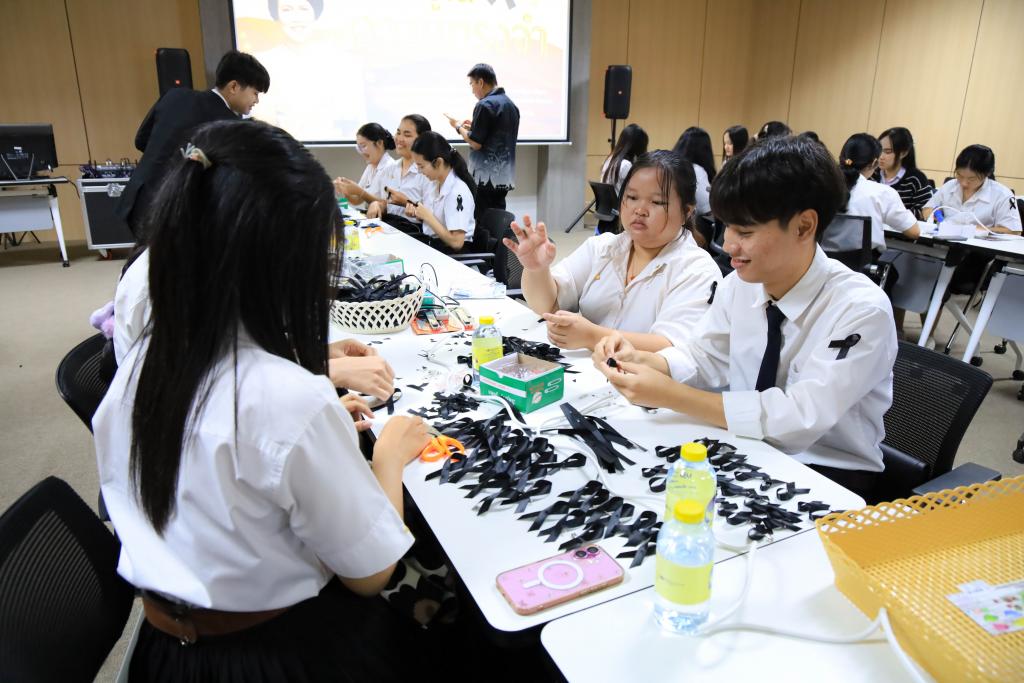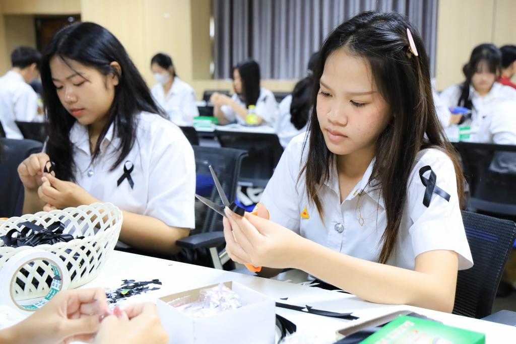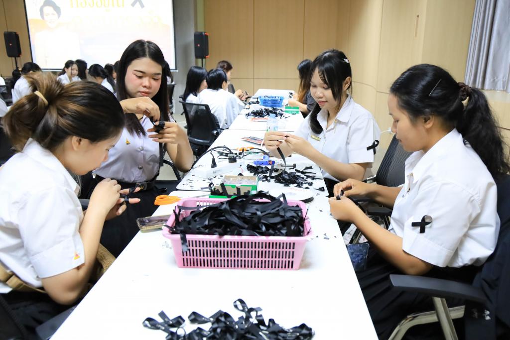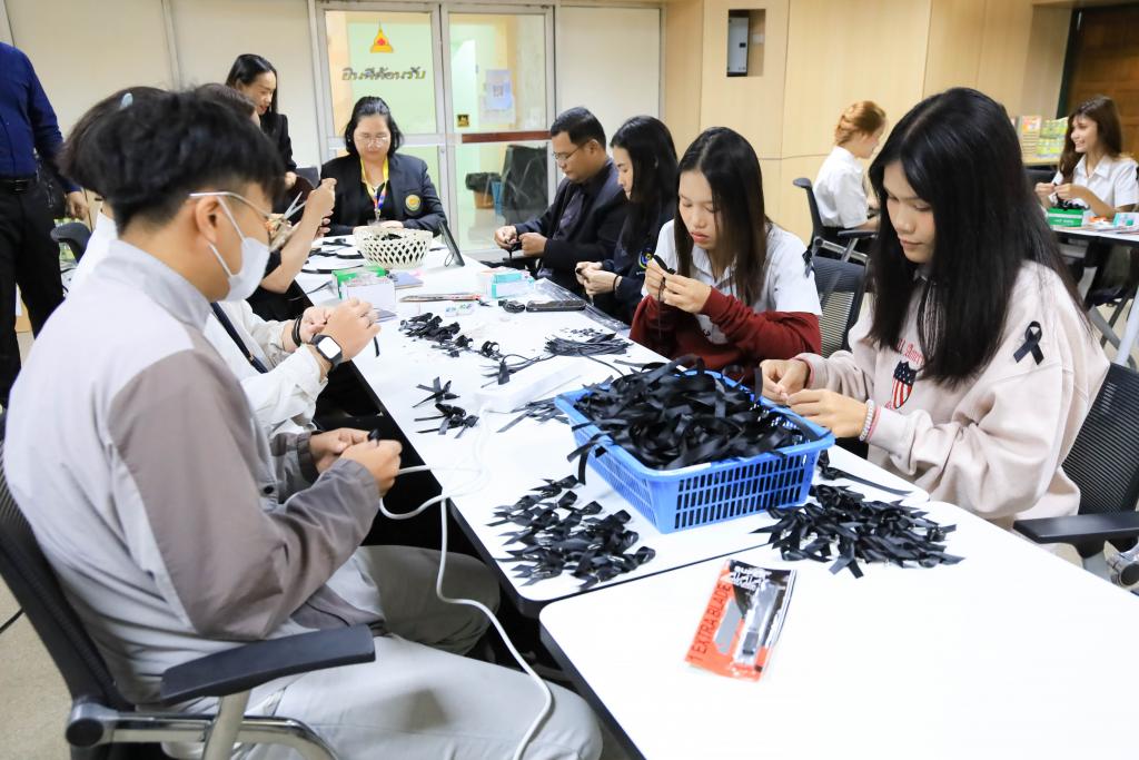 มหาวิทยาลัยอุบลราชธานี โดย สำนักงานพัฒนานักศึกษา และองค์การนักศึกษา พร้อมใจจิตอาสาร่วมกิจกรรมโครงการจัดทำริบบิ้นดำถวายความอาลัย เพื่อน้อมรำลึกในพระมหากรุณาธิคุณ สมเด็จพระนางเจ้าสิริกิติ์ พระบรมราชินีนาถ พระบรมราชชนนีพันปีหลวง โดยมี รองศาสตราจารย์ ดร.ชุตินันท์ ประสิทธิ์ภูริปรีชา อธิการบดี พร้อมด้วย ผู้ช่วยศาสตราจารย์ ดร.ปรีชา บุญจูง รองอธิการบดีฝ่ายพัฒนานักศึกษาและศิษย์เก่าสัมพันธ์ นำบุคลากร และนักศึกษาร่วมทำริบบิ้นดำ ระหว่างวันที่14 – 16 พฤศจิกายน 2568 ณ ห้องประชุม ชั้น 4 สำนักงานอธิการบดี 1กำหนดจำนวน 30,000 ชิ้น เพื่อนำแจกจ่ายให้กับนักศึกษา บุคลากร ตลอดจนบัณฑิตและญาติที่เดินทางมาร่วมงาพิธีพระราชทานปริญญาบัตร ในช่วงเดือนธันวาคม 2568