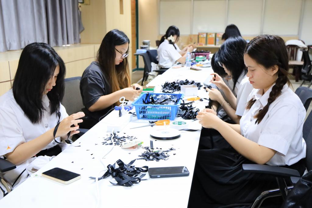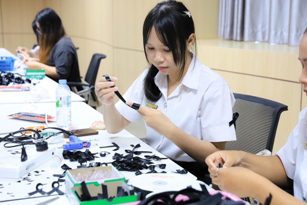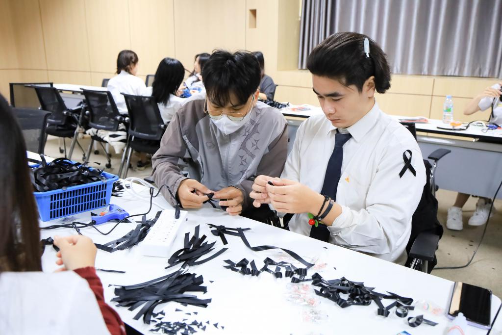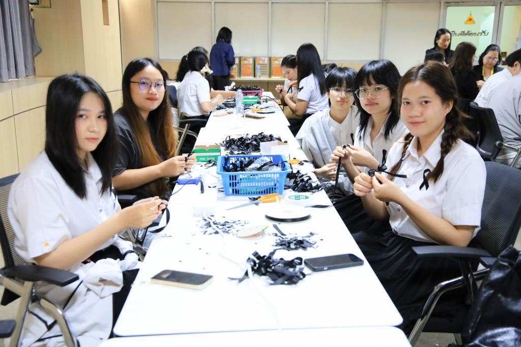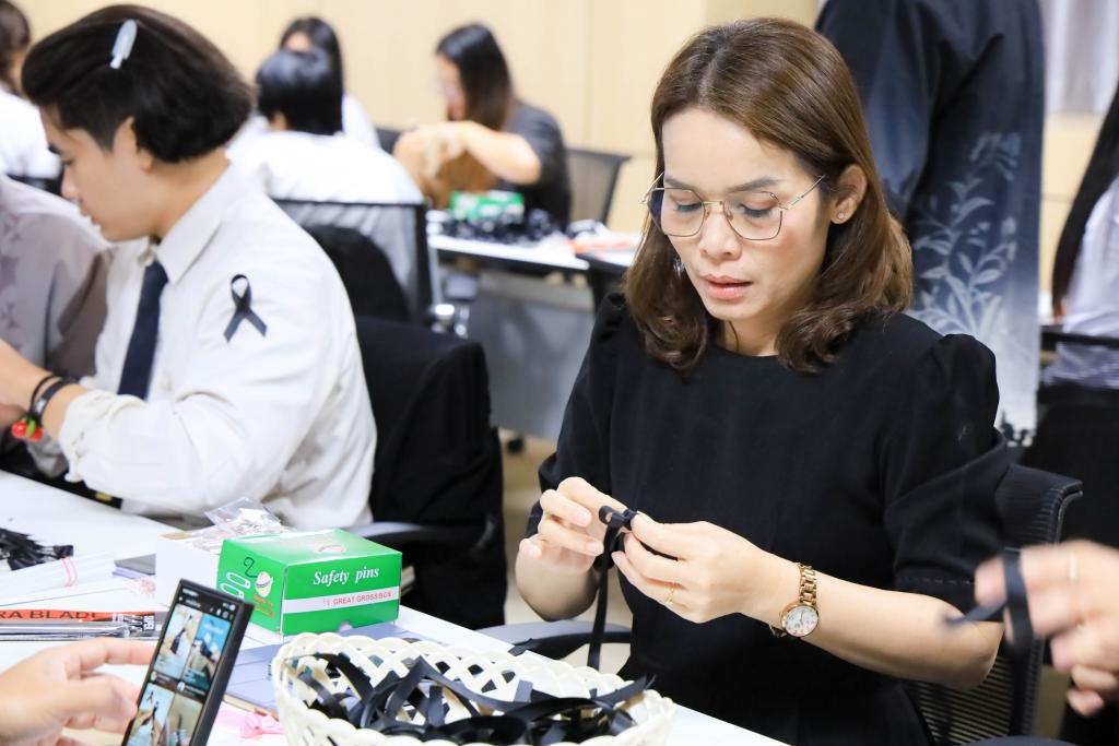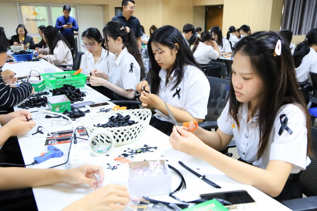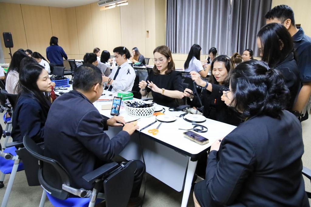 มหาวิทยาลัยอุบลราชธานี โดย สำนักงานพัฒนานักศึกษา และองค์การนักศึกษา พร้อมใจจิตอาสาร่วมกิจกรรมโครงการจัดทำริบบิ้นดำถวายความอาลัย เพื่อน้อมรำลึกในพระมหากรุณาธิคุณ สมเด็จพระนางเจ้าสิริกิติ์ พระบรมราชินีนาถ พระบรมราชชนนีพันปีหลวง โดยมี รองศาสตราจารย์ ดร.ชุตินันท์ ประสิทธิ์ภูริปรีชา อธิการบดี พร้อมด้วย ผู้ช่วยศาสตราจารย์ ดร.ปรีชา บุญจูง รองอธิการบดีฝ่ายพัฒนานักศึกษาและศิษย์เก่าสัมพันธ์ นำบุคลากร และนักศึกษาร่วมทำริบบิ้นดำ ระหว่างวันที่14 – 16 พฤศจิกายน 2568 ณ ห้องประชุม ชั้น 4 สำนักงานอธิการบดี 1กำหนดจำนวน 30,000 ชิ้น เพื่อนำแจกจ่ายให้กับนักศึกษา บุคลากร ตลอดจนบัณฑิตและญาติที่เดินทางมาร่วมงาพิธีพระราชทานปริญญาบัตร ในช่วงเดือนธันวาคม 2568