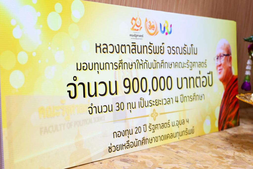 คณะรัฐศาสตร์ มหาวิทยาลัยอุบลราชธานี ขอน้อมกราบขอบพระคุณ หลวงตาสินทรัพย์ จรณธัมโม รวมถึงพระเถระ แม่ชี และญาติธรรมผู้มีจิตศรัทธา ที่ให้การสนับสนุนภารกิจด้านการศึกษาของคณะด้วยความเมตตาและปรารถนาดีเสมอมา ทางคณะฯ จะเดินหน้าพัฒนานักศึกษาให้มีคุณภาพ มีคุณธรรม และเป็นกำลังสำคัญของสังคมต่อไป
