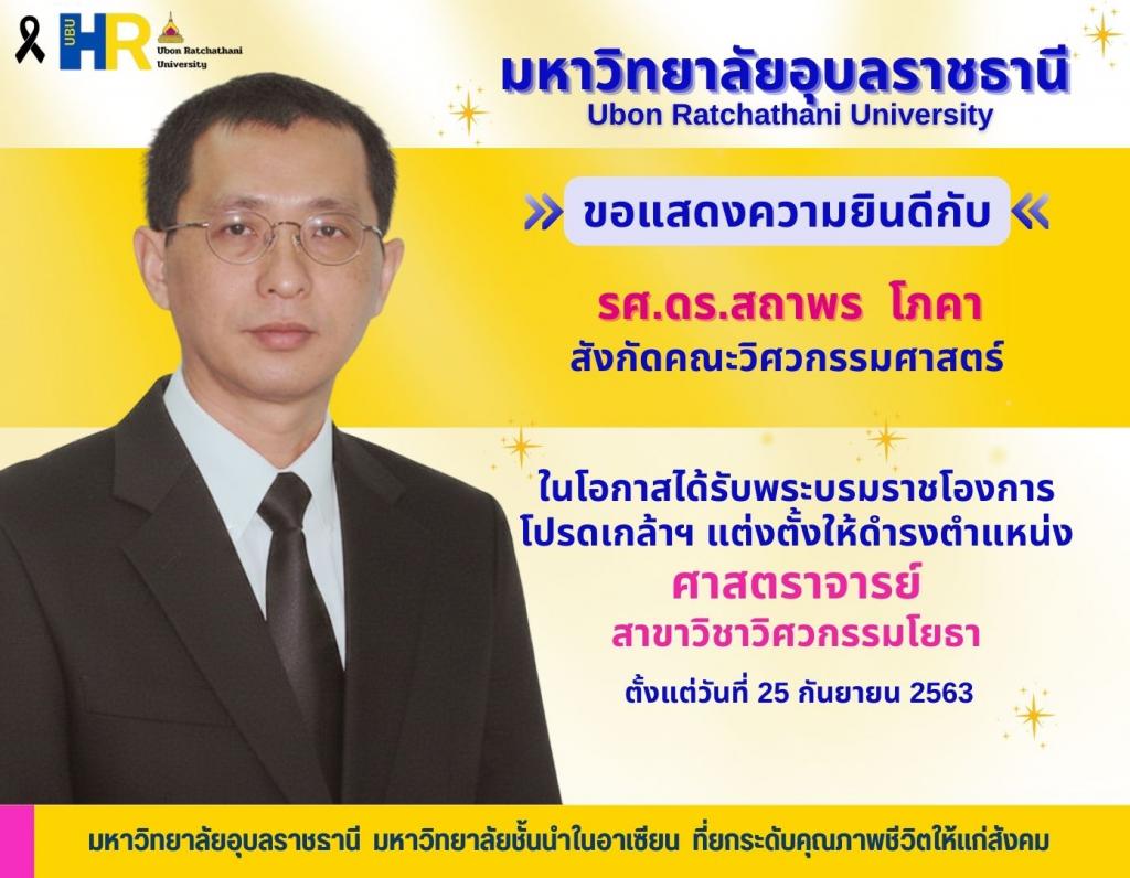 ตามประกาศสำนักนายกรัฐมนตรี เรื่อง แต่งตั้งศาสตราจารย์ (ประกาศ ณ วันที่ 24 พฤศจิกายน 2568) มีพระบรมราชโองการโปรดเกล้าโปรดกระหม่อมแต่งตั้ง รองศาสตราจารย์สถาพร โภคา พนักงานมหาวิทยาลัย ตำแหน่งรองศาสตราจารย์ สังกัดคณะวิศวกรรมศาสตร์ ให้ดำรงตำแหน่งศาสตราจารย์ ในสาขาวิชาวิศวกรรมโยธา ตั้งแต่วันที่ 25 กันยายน 2563