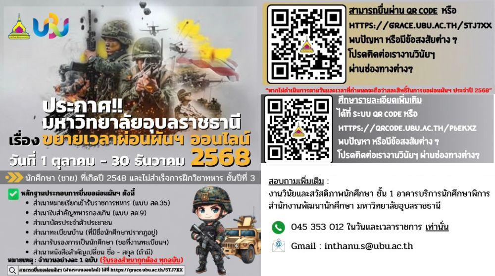 ประกาศขยายเวลายื่นคำร้องขอผ่อนผันการตรวจเลือกเข้ารับราชการทหารกองประจำการ ประจำปีการศึกษา 2568