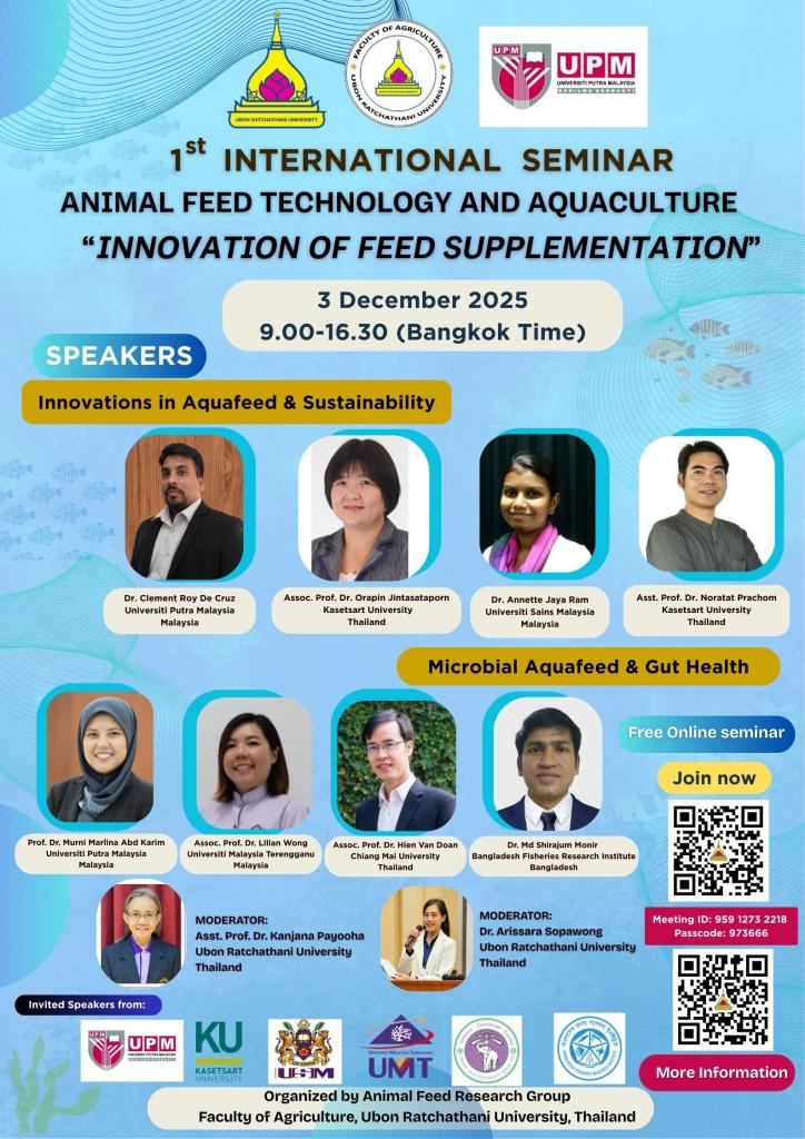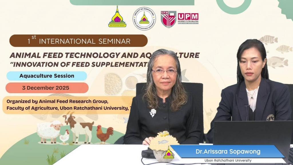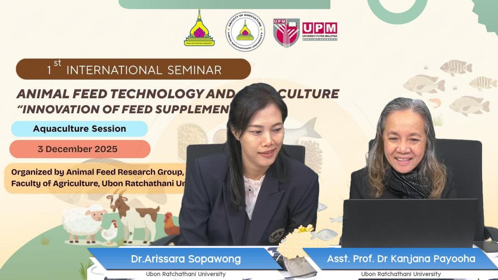 มหาวิทยาลัยอุยบราชธานี โดย คณะเกษตรศาสตร์ จัดงานสัมมนาระดับนานาชาติ 1st International Seminar on Animal Feed Technology and Aquaculture “Innovation of Supplementation” โดยมี ดร.นรินทร บุญพราหมณ์ คณบดีคณะเกษตรศาสตร์ เป็นประธานเปิดงาน และ รองศาสตราจารย์ ดร.เรืองยศ พิลาจันทร์กล่าวรายงาน โดยมี ผู้เชี่ยวชาญจากหลากหลายประเทศและร่วมแลกเปลี่ยนองค์ความรู้ด้านโภชนาการสัตว์ เทคโนโลยีอาหารสัตว์ นวัตกรรมด้าน Feed Supplementationจัดโดย กลุ่มวิจัยอาหารสัตว์ คณะเกษตรศาสตร์ มหาวิทยาลัยอุบลราชธานี ร่วมกับ Faculty of Agriculture, Universiti Putra Malaysia (UPM)ประเทศมาเลซีย โอกาสนี้ Assoc.Prof.Dr.Eric Lim Teik Chung, Head of Animal Science Department UPM กล่าวการริเริ่มความร่วมมือทางวิชาการทั้งสองสถาบันและกิจกรรมความร่วมมือในอนาคต ณ ห้องประชุมวรพงษ์ สุริยภัทร คณะเกษตรศาสตร์ เมื่อวันที่ 3 ธันวาคม 2568