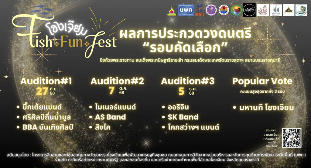 สำหรับงาน “โขงเจียม Fish-Fun-Fest” และการประกวดแข่งขันดนตรีร่วมสมัยเชิงสร้างสรรค์ชิงถ้วยพระราชทานสมเด็จพระกนิษฐาธิราชเจ้า กรมสมเด็จพระเทพรัตนราชสุดาฯ สยามบรมราชกุมารี ดำเนินการจัดขึ้น ตั้งแต่สิงหาคม 2568 – มกราคม 2569 โดยกำหนดจัดการประกวดรวม 5 ครั้ง ในรอบคัดเลือก (Audition) ณ ที่ตั้ง มาแล้ว 3 ครั้งและครั้งที่ 4 จะจัดขึ้นในวันเสาร์ที่ 13 ธันวาคม 2568 รวม 12 ทีม เพื่อคัดเลือก 3 ทีม เข้ารอบรองชนะเลิศ และจะพิจารณาคัดเลือก 1 ทีม ที่ได้รับคะแนน Popular Voteมากที่สุดในรอบคัดเลือก 3 ครั้ง รับสิทธิ์ผ่านเข้ารอบรองชนะเลิศรวม 10 ทีม ในวันเสาร์ที่ 13 ธันวาคม 2568 เพื่อคัดเลือก 5 ทีมสุดท้าย เข้าร่วมการแข่งขันในรอบชิงชนะเลิศ ซึ่งกำหนดจัดขึ้น ในวันพฤหัสบดีที่ 1 มกราคม 2569 ตามลำดับ เพื่อชิงเงินรางวัลมูลค่ารวม 50,000.- บาท
