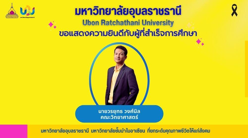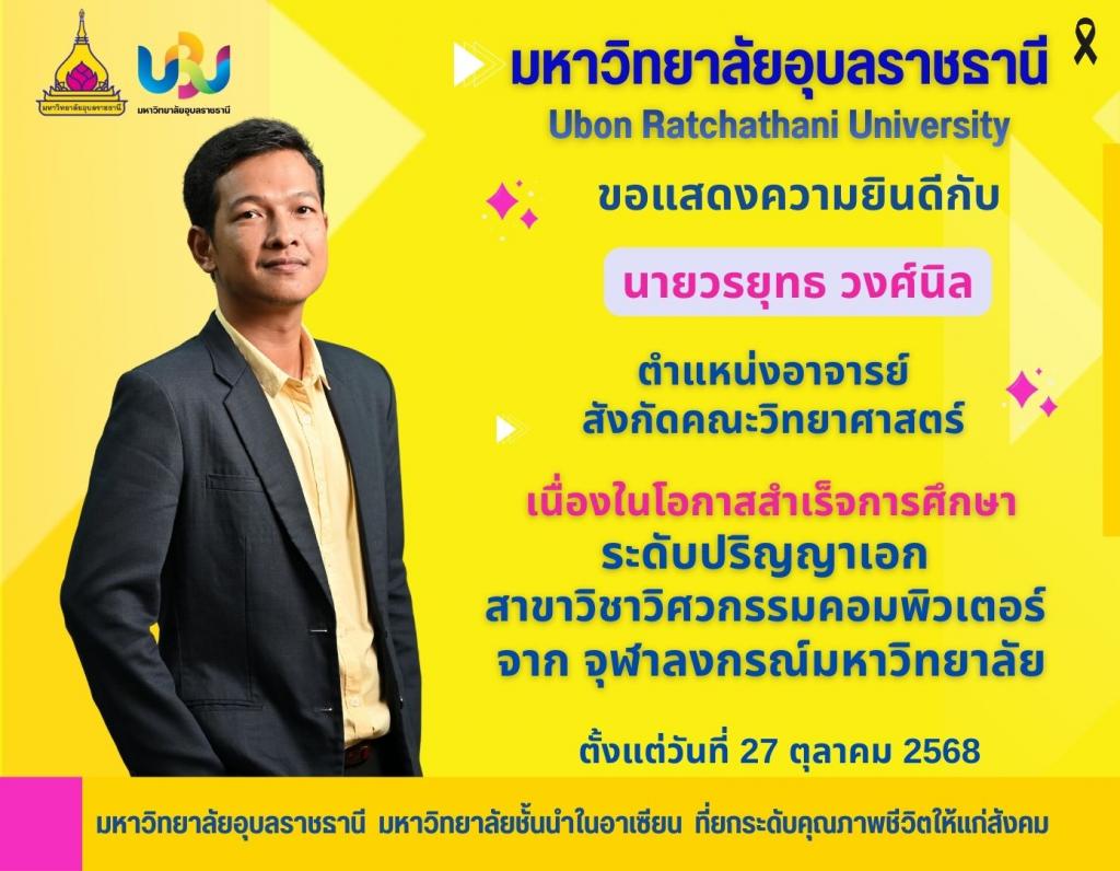 มหาวิทยาลัยอุบลราชธานีขอแสดงความยินดีกับคณาจารย์เนื่องในโอกาสที่สำเร็จการศึกษา ราย นายวรยุทธ วงศ์นิล ตำแหน่งอาจารย์ สังกัดคณะวิทยาศาสตร์ สำเร็จการศึกษาระดับปริญญาเอก สาขาวิชาวิศวกรรมคอมพิวเตอร์ จากจุฬาลงกรณ์มหาวิทยาลัย ตั้งแต่วันที่ 27 ตุลาคม 2568