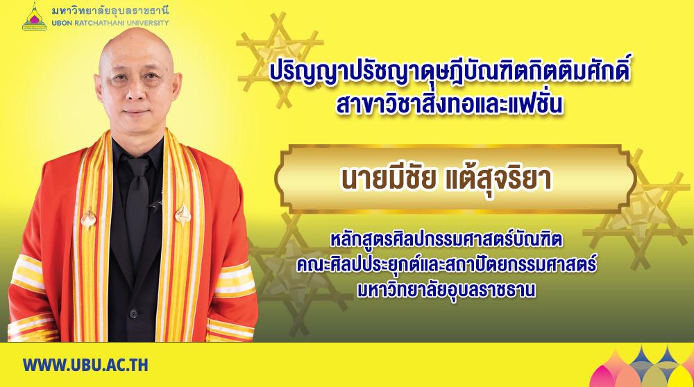 มหาวิทยาลัยอุบลราชธานี มีความยินดีประกาศเกียรติคุณเพื่อเชิดชูเกียรติ นายมีชัย แต้สุจริยา ที่ได้รับปริญญาปรัชญาดุษฎีบัณฑิตกิตติมศักดิ์ หลักสูตรศิลปกรรมศาสตร์บัณฑิต สาขาออกแบบสิ่งทอและแฟชั่น คณะศิลปประยุกต์และสถาปัตยกรรมศาสตร์ มหาวิทยาลัยอุบลราชธานี โดย สภามหาวิทยาลัยอุบลราชธานี ได้พิจารณาอนุมัติปริญญากิตติมศักดิ์ ประจำปีการศึกษา ๒๕๖๗ แก่บุคคลผู้มีผลงานทางวิชาการดีเด่นในสาขาที่มีการสอนในมหาวิทยาลัย ทำคุณประโยชน์อย่างยิ่งแก่มหาวิทยาลัยหรือประเทศชาติหรือนานาชาติ สมควรได้รับการยกย่องเป็นแบบอย่างให้ผู้อื่นเจริญรอยตาม ผลงานสามารถนำไปใช้ประโยชน์อย่างกว้างขวางอันส่งผลดีต่อการพัฒนาองค์ความรู้ขององค์กร สังคม ประเทศชาติหรือนานาชาติ โดยจะเข้ารับพระราชทานปริญญากิตติมศักดิ์ ประจำปีการศึกษา ๒๕๖๗ ในวันพุธที่ ๒๔ ธันวาคม พ.ศ. ๒๕๖๘ ณ อาคารเฉลิมพระเกียรติ ๗ รอบ พระชนมพรรษา มหาวิทยาลัยอุบลราชธานี