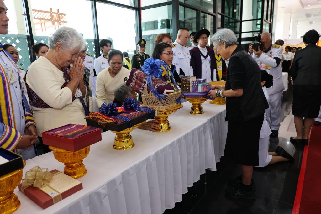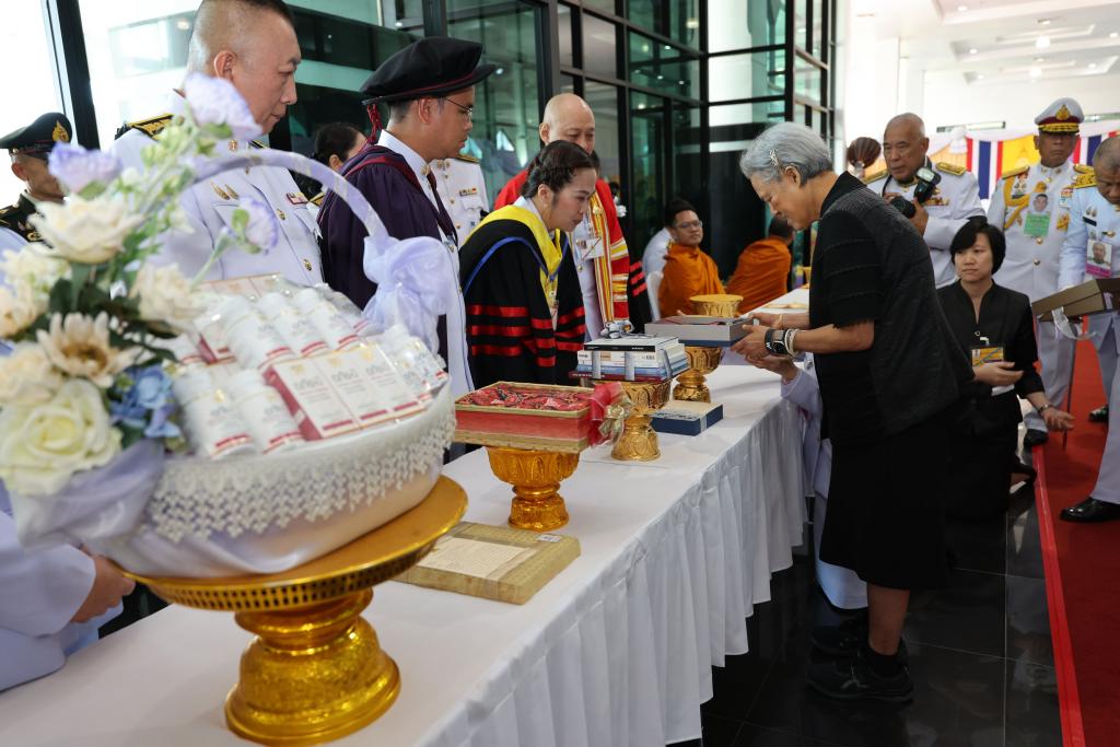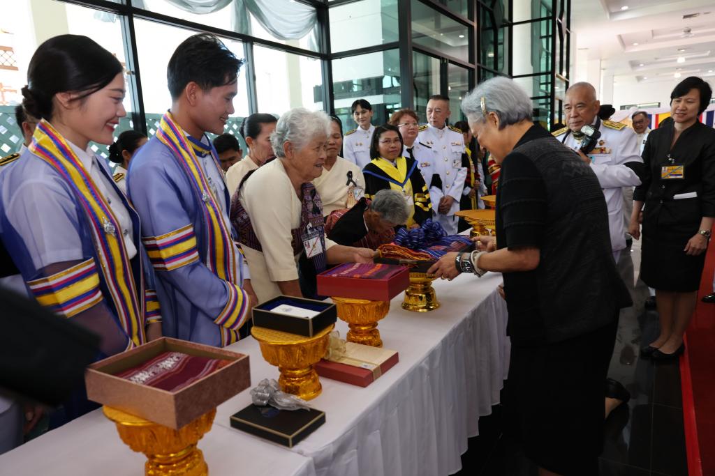 จากนั้น เสด็จไปยังบริเวณโถงอาคารเฉลิมพระเกียรติ 7 รอบ พระชนมพรรษา เพื่อฉายพระฉายาลักษณ์ร่วมกับคณะผู้บริหาร ผู้ทรงคุณวุฒิ และคณะทำงาน จำนวน 2 ชุด ในโอกาสนี้ ศาสตราจารย์พิเศษจอมจิน จันทรสกุล นายกสภามหาวิทยาลัยอุบลราชธานี กราบบังคมทูลเบิก รองศาสตราจารย์ ดร.ชุตินันท์ ประสิทธิภูริปรีชา อธิการบดีมหาวิทยาลัยอุบลราชธานี เข้าเฝ้า ฯ ทูลเกล้า ฯ ถวายเงินโดยเสด็จพระราชกุศลตามพระราชอัธยาศัย และให้นักศึกษาทุนพระราชทานในสมเด็จพระกนิษฐาธิราชเจ้า กรมสมเด็จพระเทพรัตนราชสุดา ฯ สยามบรมราชกุมารี เข้าเฝ้าฯ จำนวน 9 ราย และในปีนี้ รองศาสตราจารย์ ดร.ชุตินันท์ ประสิทธิภูริปรีชา อธิการบดีมหาวิทยาลัยอุบลราชธานี ทูลเกล้าฯ ถวาย “ผ้าไหม” พระครูโกศลสิกขกิจ ถวายเงินโดยเสด็จพระราชกุศลตามพระราชอัธยาศัยนายมีชัย แต้สุจริยา ทูลเกล้าฯ ถวาย “ผ้าไหม” รองอธิการบดี ผู้แทนนักศึกษา ผู้แทนบัณฑิต และผู้แทนบัณฑิต ทูลเกล้าฯ ถวาย “มาลัยข้อพระกร สูจิบัตร และแก้วที่ระลึก” พระปกรณ์ ปุกหุต คณะศิลปศาสตร์ ทูลเกล้าฯ ถวาย “หนังสือ 7 รายการ รวม 9 เล่ม” ในนามคณะสงฆ์วัดศรีบุญเรือง นางคูณ นวนอะนัน คณะศิลปศาสตร์ ทูลเกล้าฯ ถวาย “ทุงผะเหวด ซิ่นหมี่คั่น ผ้าโสร่งไหม และหมอนขิดลายดอกม่วงเทพรัตน์” นางหนูเทียม ยอดคำมี คณะศิลปะศาสตร์ ทูลเกล้าฯ ถวาย “ทุงพุทธบูชา (ทุงผะเหวด ทุงขิด) และแพรขิตไหม” รองศาสตราจารย์ ดร.พรทิพย์ ไววุฒิ คณะเภสัชศาสตร์ ทูลเกล้าฯ ถวาย “อภัย-บี กลีบบัวแดงชนิดแคปซูล” ผู้ช่วยศาสตราจารย์ ดร.กิตติยา วงษ์ขันธ์ คณะวิทยาศาสตร์ “ผลิตภัณฑ์จากข้าวไรซ์เบอร์รี่และแก่นตะวัน” ดร.ศิริพร จันทนสกุลวงศ์ คณบดีคณะรัฐศาสตร์ ทูลเกล้าฯ ถวาย “กระเป๋าย่ามผ้าไหมสะพายข้าง” อาจารย์ธนเชษฐ์ วิสัยจร คณะรัฐศาสตร์ ทูลเกล้าฯ ถวาย “หนังสือจากงานวิจัยและผลงานแปล” นางวิยะดา อุนนะนันทน์ คณะรัฐศาสตร์ “ผ้าไหมคลุมไหล่เกสรทุมมา” รองศาสตราจารย์ ดร.สิทธิชัย สมานชาติ คณะศิลปประยุกต์และสถาปัตยกรรมศาสตร์ ทูลเกล้าฯ ถวาย “กระเป๋าเอกสาร ผ้าพิมพ์ลาย” และนายสุทธิพงศ์ บัวหอม คณะวิทยาศาสตร์ ทูลเกล้าฯ ถวาย “แพรขิดบ้านสัง อ.กันทรารมย์ จ.ศรีสะเกษ”