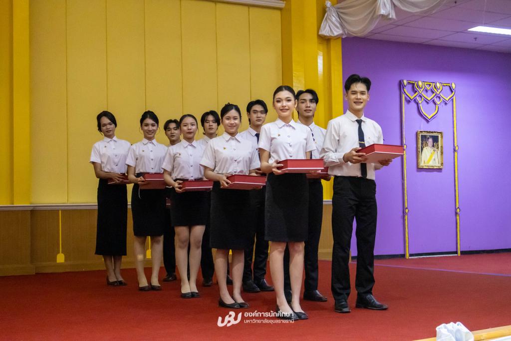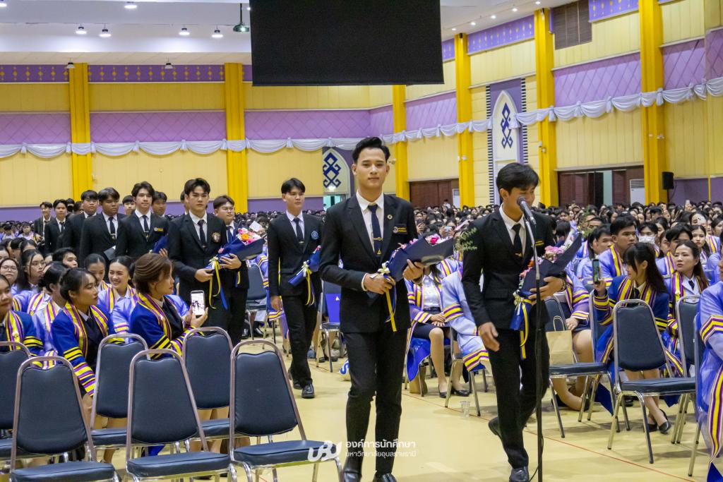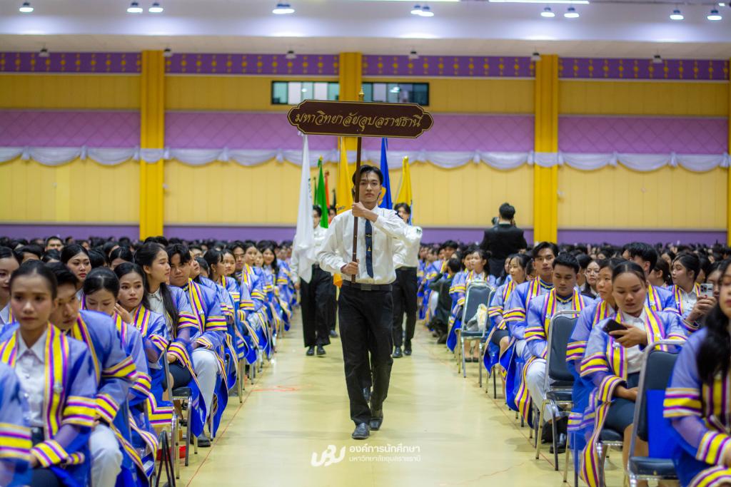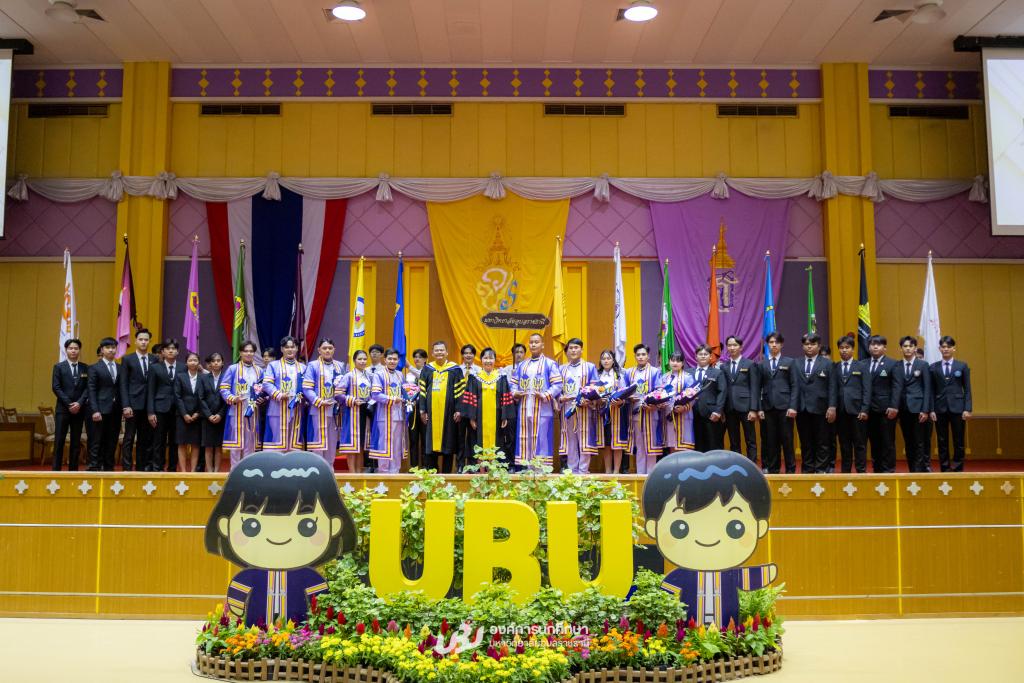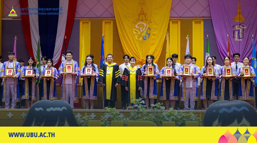 มหาวิทยาลัยอุบลราชธานี โดยองค์การนักศึกษา สภานักศึกษา สโมสรนักศึกษาคณะ และสำนักงานพัฒนานักศึกษา จัดโครงการ “เชิดชูเกียรติบัณฑิตผู้นำนักศึกษา ประจำปี 2567 รุ่นที่ 34”เพื่อร่วมแสดงความยินดีและยกย่องเกียรติคุณบัณฑิตที่มีผลการเรียนดีเยี่ยมและบัณฑิตนักกิจกรรมผู้ทำประโยชน์แก่ส่วนรวม รับเกียรติจาก รองศาสตราจารย์ ดร.ชุตินันท์ ประสิทธิภูริปรีชา อธิการบดี เป็นประธานในพิธีมอบโล่รางวัลและเกียรติบัตร โอกาสนี้ ผู้ช่วยศาสตราจารย์ ดร.ปรีชา บุญจูง รองอธิการบดีฝ่ายพัฒนานักศึกษาและศิษย์เก่าสัมพันธ์ พร้อมด้วยผู้นำนักศึกษา นายกองค์การนักศึกษา ประธานสภานักศึกษา และนายกสโมสรนักศึกษาคณะ ร่วมมอบช่อดอกไม้แสดงความยินดี ซึ่งจัดกิจกรรมหลังเสร็จสิ้นการฝึกซ้อมใหญ่พิธีพระราชทานปริญญาบัตรณ อาคารเฉลิมพระเกียรติ 7 รอบ พระชนมพรรษา เมื่อวันที่ 22 ธันวาคม 2568 ที่ผ่านมา
