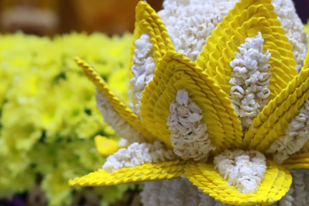 - มาลัยข้าวตอก แทนดอกมณฑารพ ดอกไม้ทิพย์แห่งสรวงสวรรค์ เครื่องบูชาในบุญเดือน 3 หรือบุญข้าวจี่ (วันมาฆบูชา) สื่อถึงการงอกงามและการสืบต่อแห่งบุญปัญญา เอกลักษณ์อำเภอมหาชนะชัย จังหวัดยโสธร