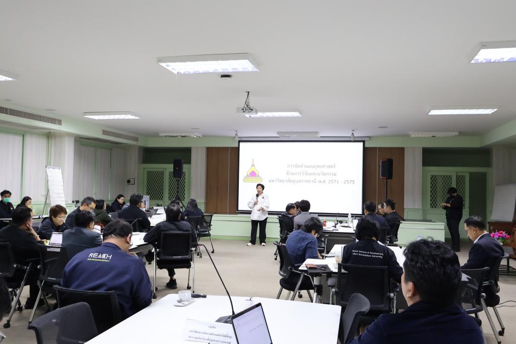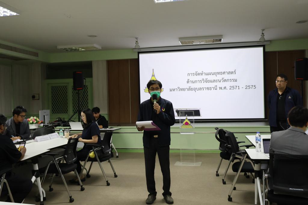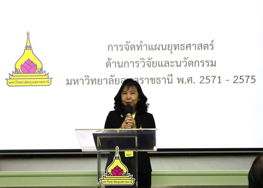 รับเกียรติจาก รองศาสตราจารย์ชุตินันท์ ประสิทธิ์ภูริปรีชา อธิการบดี เป็นประธานกล่าวเปิดการประชุม พร้อมด้วย ศาสตราจารย์ทวนทอง จุฑาเกตุ รองอธิการบดีฝ่ายวิจัยและนวัตกรรม กล่าวรายงานวัตถุประสงค์ และนำเสนอ (ร่าง) แผนยุทธศาสตร์ด้านการวิจัยและนวัตกรรม มหาวิทยาลัยอุบลราชธานี พ.ศ. 2571–2575เพื่อใช้เป็นกรอบในการแลกเปลี่ยนความคิดเห็นร่วมกัน