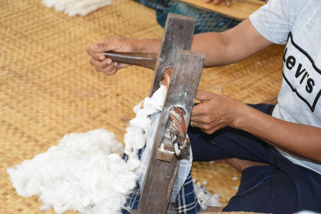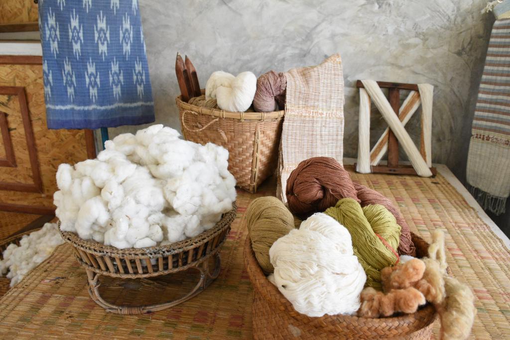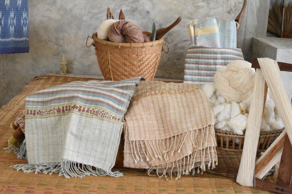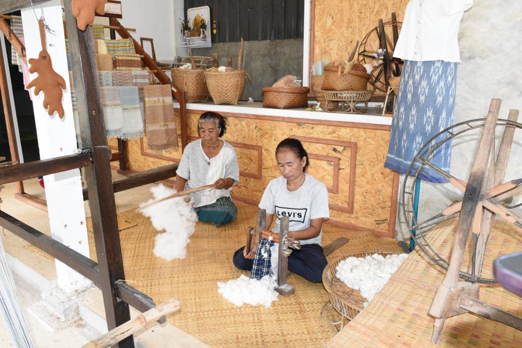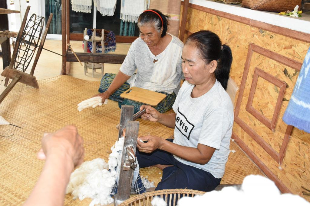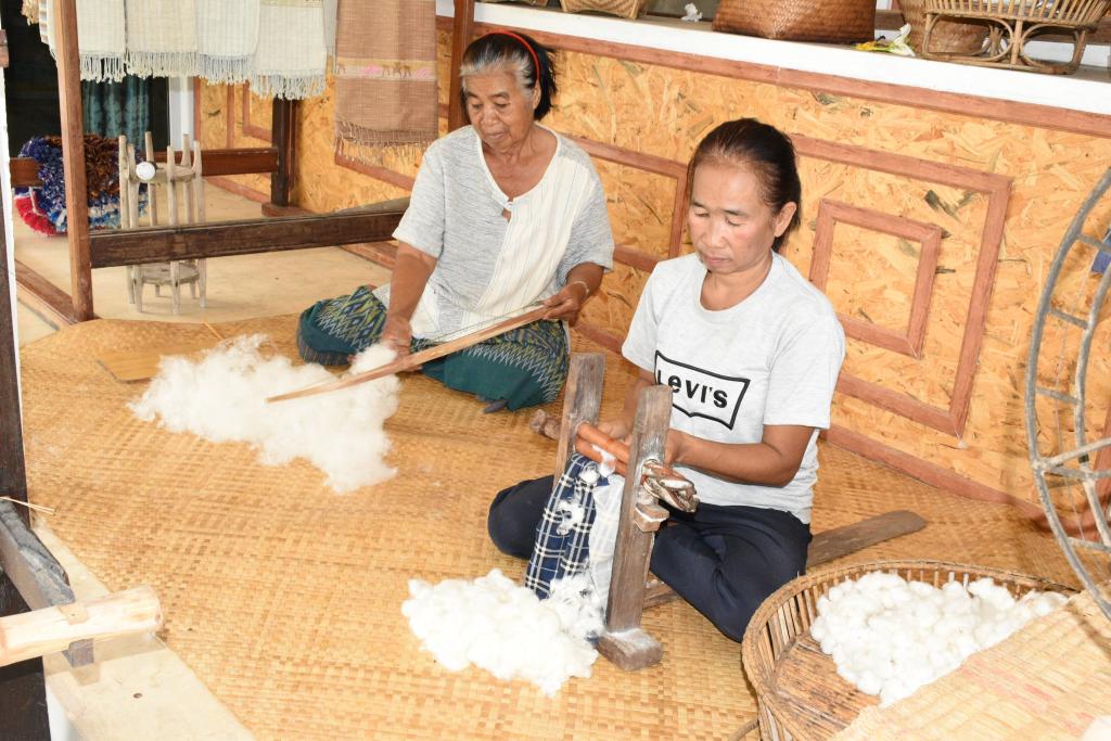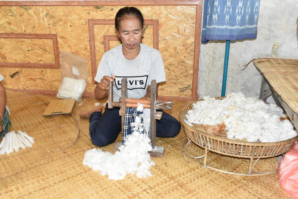 แหล่งที่มาของฝ้าย กลุ่มจะปลูกฝ้ายเองริมแม่น้ำโขง ซึ่งเป็นที่มาของชื่อ "ฝ้ายชายโขง" ที่ใช้ในบรรจุภัณฑ์ของผลิตภัณฑ์ฝ้ายที่ปลูกเป็นพันธุ์พื้นบ้านโบราณ ไม่มีการรดน้ำ ใส่ปุ๋ย หรือใช้สารเคมีใด ๆ การปลูกจะทำเมื่อน้ำในแม่น้ำโขงลดลงในการเก็บเกี่ยว การเก็บดอกฝ้ายในช่วงเดือนมีนาคม - เมษายน (ประมาณ 3-4 เดือนหลังปลูก) ต้องเก็บในช่วงที่ไม่มีฝนตก เพราะความชื้นจะทำให้ดอกฝ้ายเน่าการทำความสะอาดดอกฝ้ายที่เก็บเกี่ยวมา โดยการแยกสิ่งสกปรก เช่น เศษไม้ เศษหญ้า หรือใบฝ้ายออกจากนั้น นำอิ้วฝ้าย(ปั่นฝ้าย)นำฝ้ายไปอิ้ว (กระบวนการแยกเมล็ดออกจากเส้นใย) โดยใช้เครื่องมือโบราณที่หายากในปัจจุบันเมื่ออิ้วฝ้ายเสร็จแล้วจะดีดฝ้ายนำฝ้ายที่อิ้วแล้วไปดีดให้เป็นปุยล้อฝ้ายและเข็นด้าย นำฝ้ายที่ดีดแล้วมาล้อ และเข็นเป็นเส้นด้ายบนเหล็กไนหรือหลา สมาชิกในกลุ่มจะรับผิดชอบการเข็นด้ายและนำมาขายให้กับกลุ่ม ซึ่งกลุ่มจะซื้อเส้นด้ายฝ้ายขาวจากสมาชิกในราคา 300 บาท/กิโลกรัมการเตรียมเส้นด้ายก่อนย้อมเส้นด้ายฝ้ายที่เข็นแล้วจะถูกนำไปแช่น้ำค้างคืนเพื่อให้เป็นสีขาวการย้อมสีธรรมชาติ มีเอกลักษณ์สำคัญ กลุ่มย้อมสีผ้าด้วย สีธรรมชาติ 100% เท่านั้น โดยไม่มีการใช้สารเคมีหรือสีสังเคราะห์ผสมเด็ดขาด