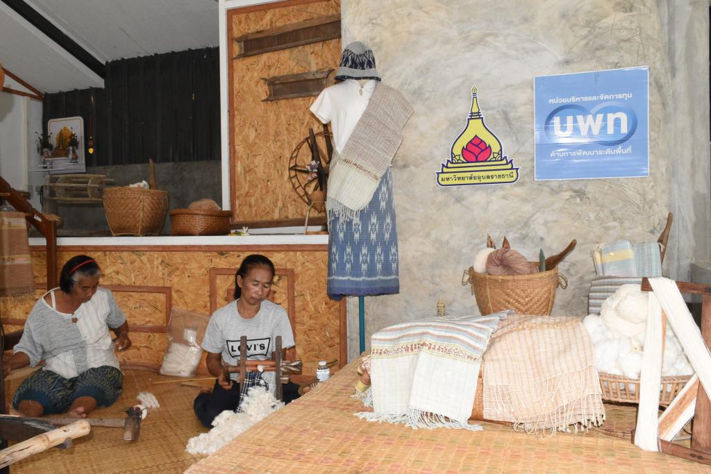 มหาวิทยาลัยอุบลราชธานี โดย คณะผู้วิจัยโครงการวิจัย “การสืบสานและต่อยอดทุนทางวัฒนธรรมโขงเจียมเพื่อพัฒนาเศรษฐกิจชุมชน” ทุนอุดหนุนการวิจัยจากหน่วยบริหารและจัดการทุนด้านการพัฒนาระดับพื้นที่ (บพท.) นำทีมโดย ผู้ช่วยศาสตราจารย์ ดร.นรา หัตถสิน รองคณบดีฝ่ายวิชาการ คณะบริหารศาสตร์ มหาวิทยาลัยอุบลราชธานี และผู้จัดการโครงการวิจัยฯ พร้อมคณะผู้วิจัยฯ ลงพื้นที่เชิญชวน แม่สนิท สินทิพย์ ประธานกลุ่มทอผ้าบ้านกุ่มตำบลห้วยไผ่อำเภอโขงเจียมจังหวัดอุบลราชธานี ผู้ประกอบการทางวัฒนธรรมโครงการวิจัยการสืบสานและต่อยอดทุนทางวัฒนธรรมโขงเจียมเพื่อพัฒนาเศรษฐกิจชุมชน เข้าร่วมโครงการและได้รับแรงบันดาลใจจาก ทีมวิจัย ม.อุบลฯ ได้มีบทบาทในการบูรณาการองค์ความรู้ทางวิชาการร่วมกับภูมิปัญญาชุมชนผ่านการวิจัยและพัฒนาลวดลาย “ผ้าฝ้ายลายผาแต้ม” ซึ่งได้รับแรงบันดาลใจจากภาพเขียนสีก่อนประวัติศาสตร์เพื่อสะท้อนอัตลักษณ์พื้นที่ประวัติศาสตร์และวิถีชีวิตของชุมชนโขงเจียมความร่วมมือดังกล่าวไม่เพียงช่วยเพิ่มมูลค่าผลิตภัณฑ์สิ่งทอชุมชนแต่ยังเป็นการส่งเสริมการอนุรักษ์วัฒนธรรมการพัฒนาเศรษฐกิจฐานรากและการใช้ทรัพยากรอย่างยั่งยืนสอดคล้องกับแนวทางความรับผิดชอบต่อสังคม(CSR) และพันธกิจของมหาวิทยาลัยในการพัฒนาท้องถิ่นอย่างมีส่วนร่วมผ้าฝ้ายลายผาแต้มจากบ้านกุ่มจึงเป็นมากกว่าผลิตภัณฑ์ชุมชนระดับ5 ดาว แต่คือผลลัพธ์ของการเชื่อมโยง “งานวิจัย– มหาวิทยาลัย– ชุมชน” เพื่อการพัฒนาอย่างยั่งยืนบนฐานวัฒนธรรม
