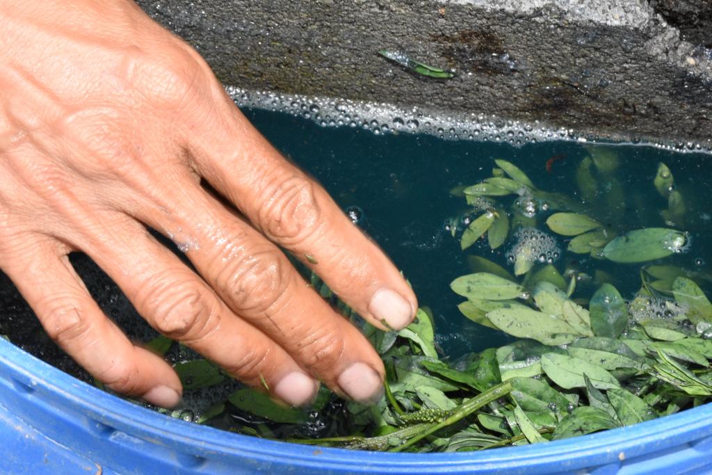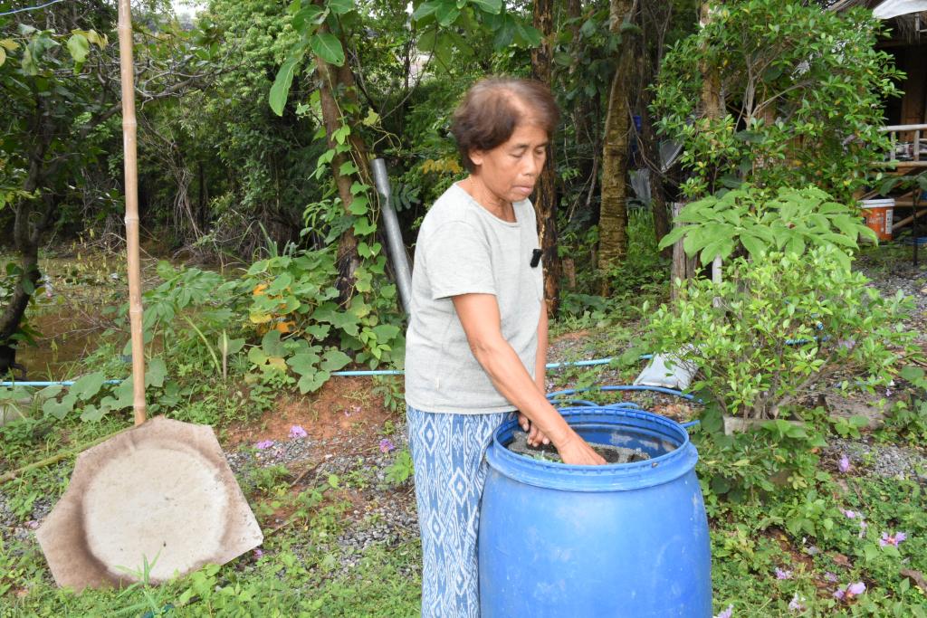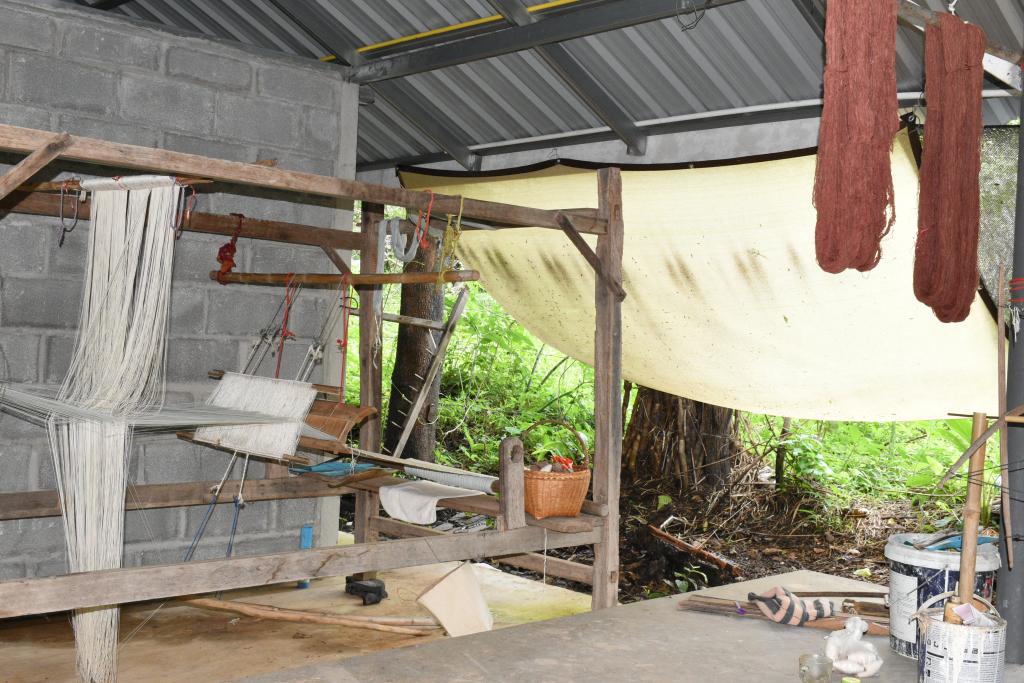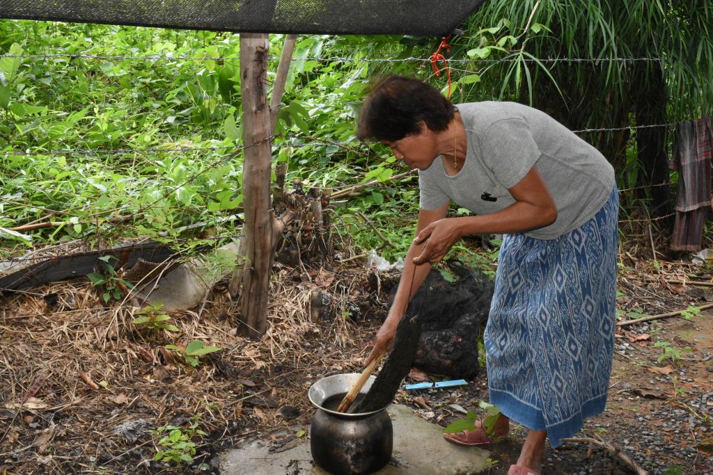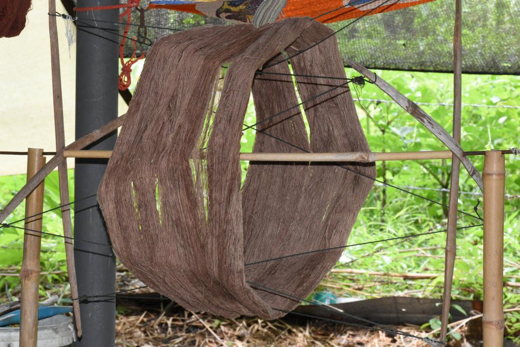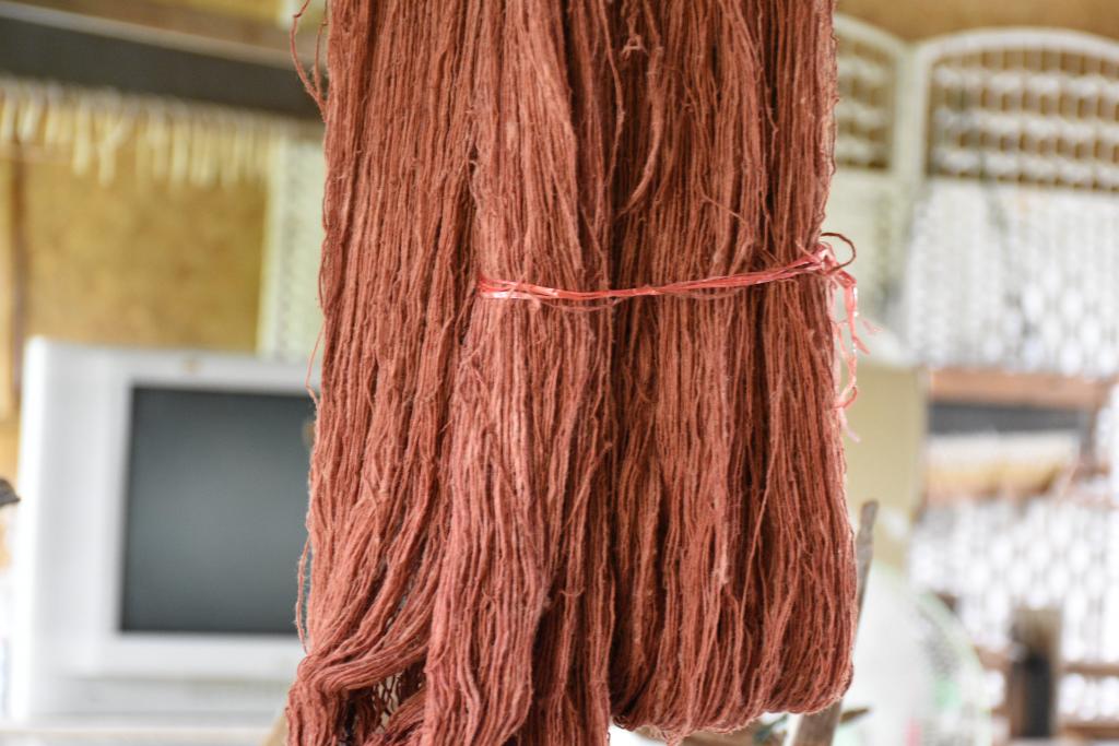 แหล่งวัตถุดิบ ใช้เปลือกไม้และพืชจากท้องถิ่น เช่น เปลือกก่อ เปลือกดู่ เปลือกเค็ง การหาวัตถุดิบมาจากในนาของตนเอง ไม่ต้องไปหาที่อื่นความหลากหลายของสี สามารถผลิตได้หลายสีจากเปลือกไม้ต่าง ๆ เช่น เปลือกก่อและเปลือกดู่ให้สีน้ำตาลเข้มเป็นต้น กระบวนการย้อมการเตรียมน้ำย้อมนำเปลือกไม้มาต้มในน้ำค้างคืน จากนั้นนำเปลือกไม้ออกก่อน เพื่อป้องกันไม่ให้เศษเปลือกไม้ติดเส้นฝ้ายการย้อมเส้นด้ายนำเส้นด้ายฝ้ายที่เตรียมไว้ลงไปต้มแช่ในน้ำย้อมที่เย็นแล้ว ประมาณ 1 คืน การแช่นานขึ้นจะช่วยให้สีติดทนทานมากขึ้นการเพิ่มความคงทนของสีเลือกใช้ต้นไม้ที่มีอายุมากมาใช้ในการย้อมเพื่อให้ได้สีที่คงทนกว่าการปรับสี สามารถเปลี่ยนสีได้โดยการเติมสารส้ม ปูน หรือสนิมลงไป เช่น ย้อมสีเหลืองแล้วนำไปแช่ในสารส้มหรือปูน สีก็จะเปลี่ยนไปในส่วนของการย้อมครามจะใช้ใบของต้นครามที่ปลูกเองนำใบครามสดมาแช่น้ำ (น้ำธรรมชาติ) หมักไว้ 1 คืน หากแช่นานเกินไปครามจะเน่าเมื่อแช่ได้ที่แล้ว จะนำครามออกและนำมา กวน พร้อมเติม ปูน เพื่อให้เกิดเนื้อครามครามที่ได้จะให้สีครามที่ใสและเป็นสีฟ้า แตกต่างจากครามของที่อื่นที่มักจะเป็นสีดำหรือสีเข้มความท้าทายของสีธรรมชาติสีที่ได้อาจแตกต่างกันไปในแต่ละฤดู หรือแม้แต่จากต้นไม้ชนิดเดียวกัน เนื่องจากอิทธิพลของน้ำฝนและความชื้น ดังนั้น จึงไม่สามารถผลิตสีให้ตรงตามออเดอร์เป๊ะ ๆ ได้