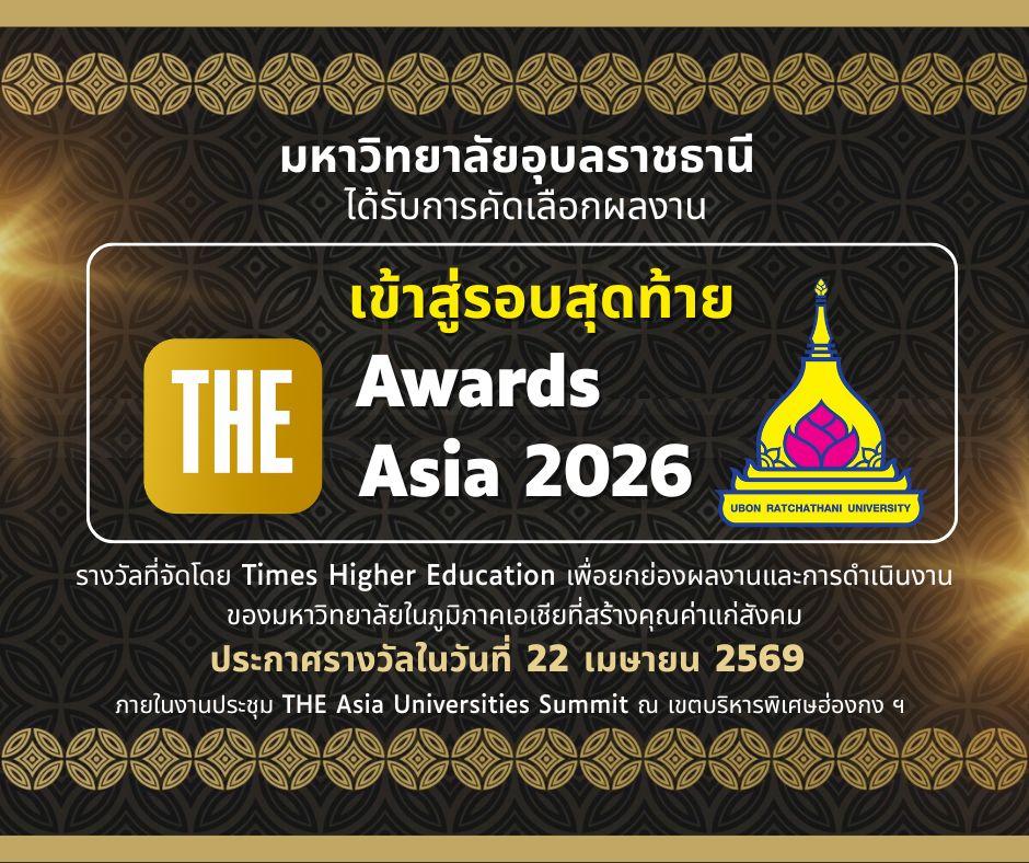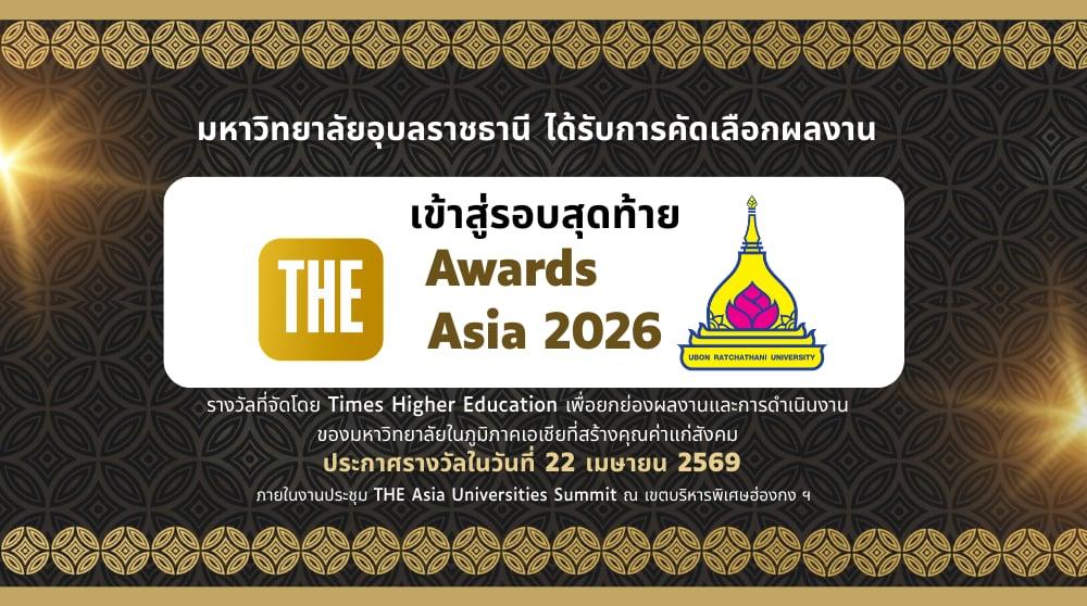 มหาวิทยาลัยอุบลราชธานีได้รับการคัดเลือกผลงานเข้าสู่ รอบสุดท้าย (Shortlisted) การประกวด THE Awards Asia 2026 ซึ่งเป็นรางวัลระดับเอเชียที่จัดโดย Times Higher Education เพื่อยกย่องผลงานและการดำเนินงานของมหาวิทยาลัยที่สร้างคุณค่าและผลกระทบเชิงบวกต่อสังคมอย่างเป็นรูปธรรมโดยผลงานที่ผ่านเข้าสู่รอบสุดท้ายได้แก่
