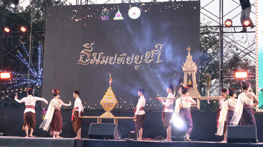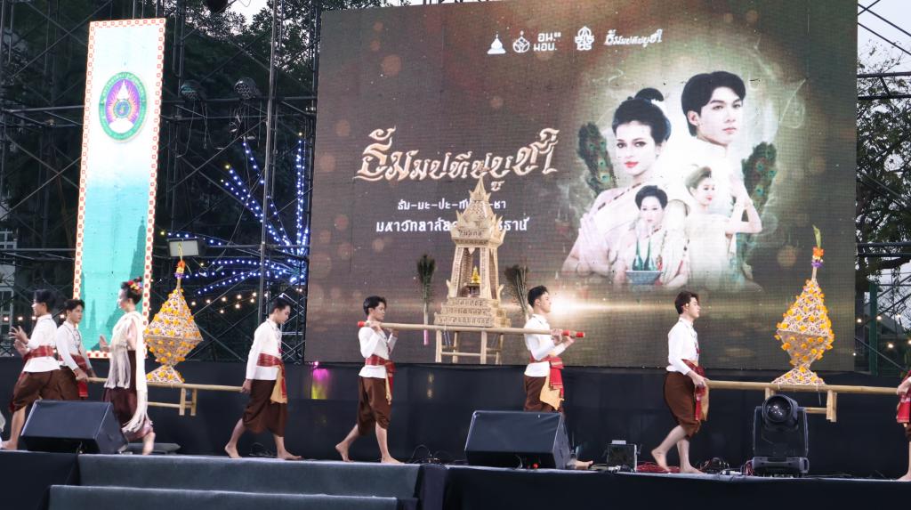ผู้ช่วยศาสตราจารย์ ดร.ปรีชา บุญจูง รองอธิการบดีฝ่ายพัฒนานักศึกษาและศิษย์เก่าสัมพันธ์ เปิดเผยว่า มหาวิทยาลัยอุบลราชธานี เข้าร่วมงานศิลปวัฒนธรรมอุดมศึกษา ต่อเนื่องมาทุกปี ในปีนี้มหาวิทยาลัยอุบลราชธานี นำการแสดงนาฏศิลป์พื้นบ้าน ชุด ธัมมปทีปบูชา ร่วมแสดง ซึ่งเป็นการนำเสนออัตลักษณ์อันโดดเด่นของจังหวัดอุบลราชธานี ผ่านเรื่องราวของพิธีกรรมการถวายเทียนพรรษาในอดีต การแสดงชุด “ธัมมปทีปบูชา”มีแนวคิดหลักมาจากการสะท้อนแรงศรัทธาในบวรพระพุทธศาสนาของชาวอีสาน โดยจำลองภาพเหตุการณ์พุทธศาสนิกชนที่พร้อมใจกันหล่อเทียนและถวายแด่พระภิกษุสงฆ์ เพื่อใช้เป็นแสงสว่างในการศึกษาพระธรรมตลอดช่วงจำพรรษา ซึ่งถือเป็นกุศลอันยิ่งใหญ่ ก่อนจะพัฒนาสู่ “ประเพณีแห่เทียนพรรษาจังหวัดอุบลราชธานี” ที่ทั่วโลกยอมรับ การแสดงชุดนี้จึงไม่เพียงแต่สื่อถึงความวิจิตรของท่วงท่ารำ แต่ยังสะท้อนถึงความสามัคคีและภูมิปัญญาท้องถิ่นที่ควรค่าแก่การอนุรักษ์สืบไป