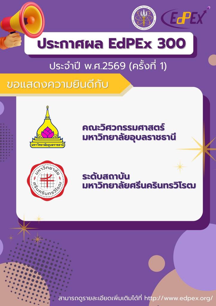 ในการนี้ สป.อว. ขอเรียนว่าคณะอนุกรรมการดำเนินงานโครงการพัฒนาคุณภาพการศึกษาสู่ความเป็นเลิศด้วยเกณฑ์คุณภาพการศึกษาเพื่อการดำเนินการที่เป็นเลิศ (Education Criteria for Performance Excellence : EdPEx) ในการประชุมครั้งที่ 1/2569 เมื่อวันที่ 23 กุมภาพันธ์ 2569 มีมติเห็นชอบให้ประกาศรายชื่อหน่วยงานที่ผ่านการตรวจประเมินคุณภาพระดับ 300 คะแนน (EdPEx300) จำนวน 2 หน่วยงาน ดังต่อไปนี้ คณะวิศวกรรมศาสตร์ มหาวิทยาลัยอุบลราชธานี และ ระดับสถาบันมหาวิทยาลัยศรีนครินทรวิโรฒ