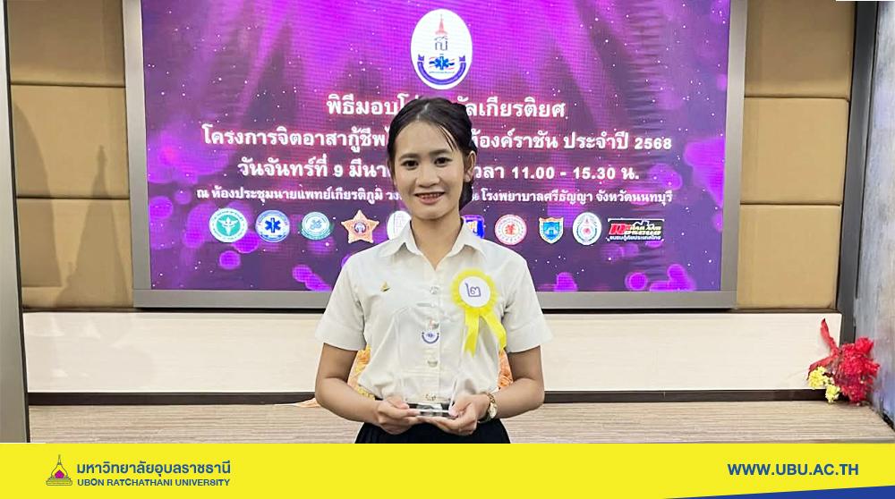 เมี่อวันที่ 9 มีนาคม 2569 คณะนิติศาสตร์ มหาวิทยาลัยอุบลราชธานี โดยมี อาจารย์มณฑิรา เตียประเสริฐ แก้วตา ได้นำนางสาวพรรณิพา ที่อุทิศ นักศึกษาคณะนิติศาสตร์ เข้ารับโล่เกียรติยศจากมูลนิธิการแพทย์ฉุกเฉินแห่งชาติ ในพระราชูปถัมภ์ สมเด็จพระกนิษฐาธิราชเจ้า กรมสมเด็จพระเทพรัตนราชสุดาฯ สยามบรมราชกุมารี ในพิธีมอบรางวัลโล่เกียรติยศ “โครงการจิตอาสากู้ชีพไทย เทิดไท้องค์ราชัน” ประจำปี 2568 ณ ห้องประชุมนายแพทย์เกียรติภูมิ วงศ์รจิต ชั้น 9 อาคารศรีธัญญา โรงพยาบาลศรีธัญญา จังหวัดนนทบุรี โดยมี พลอากาศเอก ชลิต พุกผาสุข องคมนตรี เป็นประธานในพิธีมอบรางวัลโล่เกียรติยศ