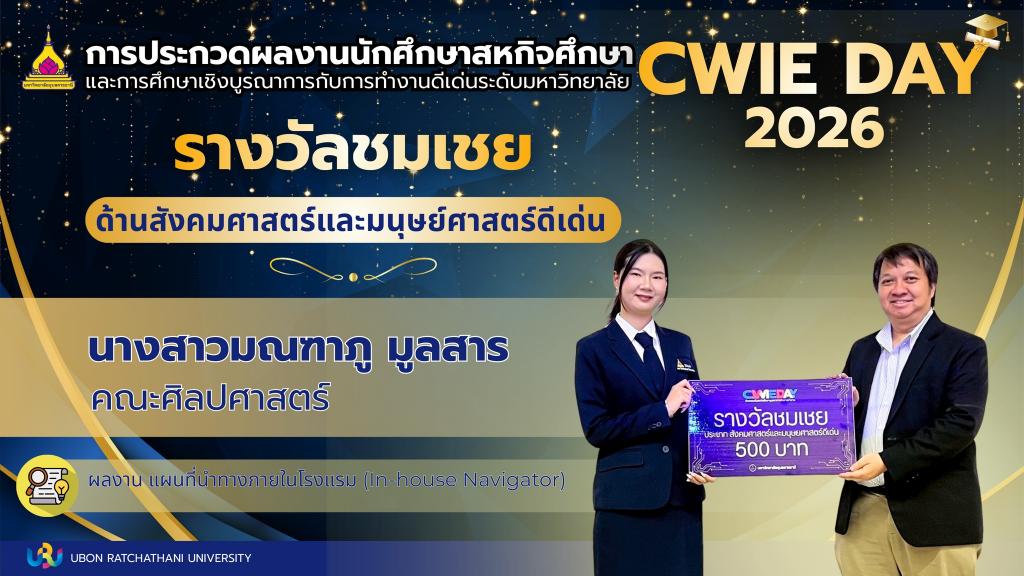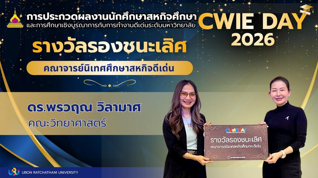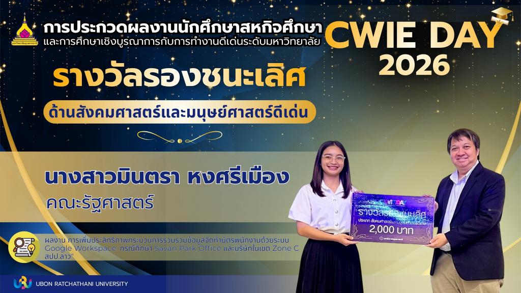 มหาวิทยาลัยอุบลราชธานี โดย งานมาตรฐานและพัฒนาหลักสูตร จัดกิจกรรม "การประกวดผลงานนักศึกษาสหกิจศึกษาและการศึกษาเชิงบูรณาการกับการทำงาน (CWIE) ดีเด่น ระดับมหาวิทยาลัย ประจำปีการศึกษา 2568" เพื่อเปิดเวทีให้นักศึกษาได้นำเสนอองค์ความรู้จากการฝึกปฏิบัติงานจริงในสถานประกอบการ มุ่งเน้นการแก้ปัญหาอย่างเป็นระบบและต่อยอดนวัตกรรมในอนาคต โดยมี ผศ.ดร.จารุวรรณ ธนวิรุฬห์ รองอธิการบดีฝ่ายวิชาการ เป็นประธานในพิธี ณ อาคารเรียนรวม 4 เมื่อวันที่ 14 มีนาคม 2569 ที่ผ่านมา