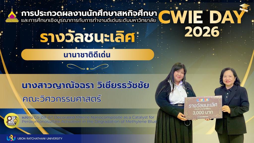 รางวัลชนะเลิศ ได้แก่ นางสาวญาณัจฉรา วิเชียรธวัชชัย นักศึกษาคณะวิศวกรรมศาสตร์ สาขาวิศวกรรมเคมี ผลงาน Co-ZIF-67 Decorated MXene Nanocomposite as a Catalyst for Peroxymonosulfate Activation in the Degradation of Methylene Blue ซึ่งมี ดร.สุภรัตน์ สาศรีเมือง เป็นอาจารย์ที่ปรึกษา