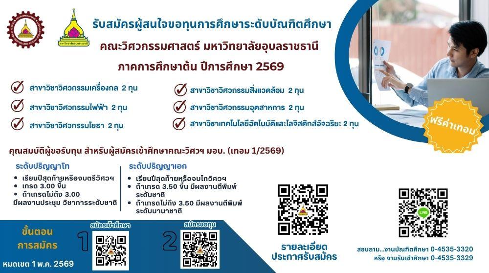 ประกาศคณะกรรมการทุนการศึกษาระดับบัณฑิตศึกษา มหาวิทยาลัยอุบลราชธานี เรื่อง การรับสมัครบุคคลเพื่อขอรับทุนการศึกษาระดับบัณฑิตศึกษา คณะวิศวกรรมศาสตร์ ปีการศึกษา 2569 ดังนี้