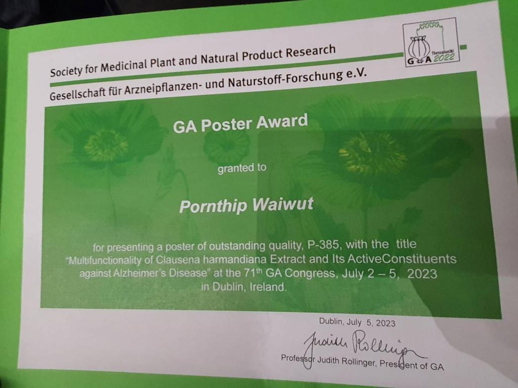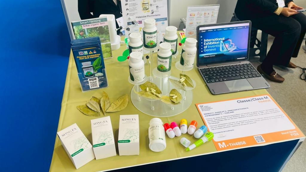 ผลงานวิจัย แคปซูลเปลือกรากส่องฟ้าต้านมะเร็ง(Clausena harmandianaRoot Bark Capsules: TAK1 Modulator - Anti-Cancer / Anti-Alzheimer’s Disease) ผลิตภัณฑ์สมุนไพรจากเปลือกรากส่องฟ้า ที่มีฤทธิ์เด่นในการต้านมะเร็งและชะลอโรคอัลไซเมอร์ ผ่านการทดสอบความปลอดภัยในอาสาสมัครแล้ว ได้รับ 2 รางวัล ได้แก่