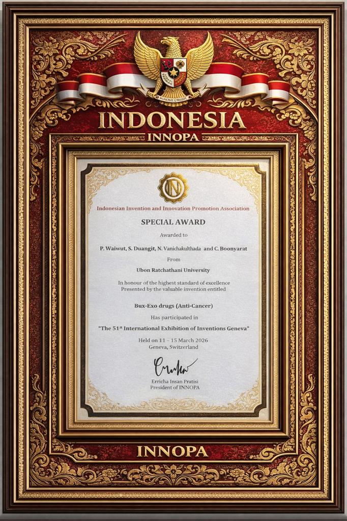 รางวัลINNOPA Special Award for the highest standard of excellence จากองค์กรนานาชาติ INNOPA (Indonesian Invention and Innovation Promotion Association) ประเทศอินโดนีเซีย